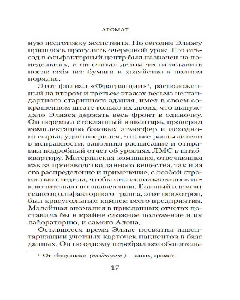 Когда Элиаса Револя спрашивают, где он работает, он отвечает: «В кабинете ароматерапии». На самом же деле он помощник ольфактора в филиале «Фрагранции» — могущественной корпорации, которая продает клиентам возможность посредством ароматов возвращаться в прошлое. К запахам у Элиаса врожденный талант — он блистательно превращает обрывки воспоминаний в химические формулы. Но, приехав на стажировку в центральный офис «Фрагранции», юноша сталкивается с жесткой, лишенной сантиментов Норой Олссон, у которой немало секретов — и корпоративных, и личных. И из-за нее Элиас, который мечтал разливать по флаконам ностальгическую радость, ввязывается в расследование страшного дела и обнаруживает, что у преступлений тоже есть запах...