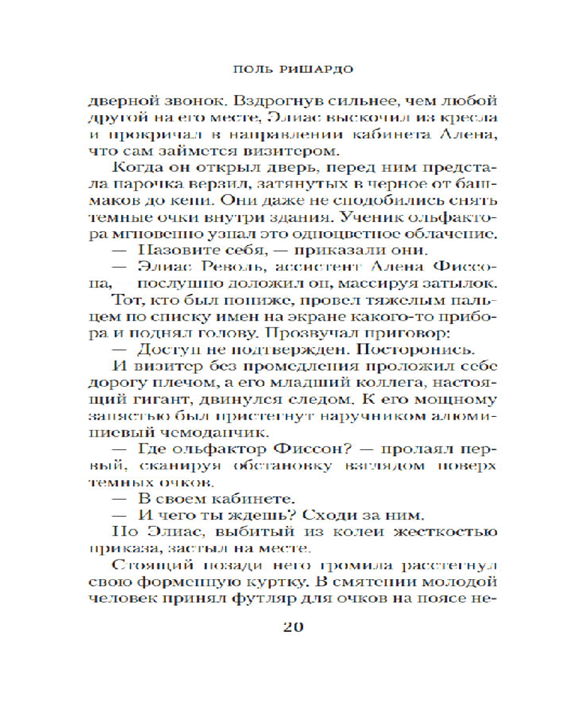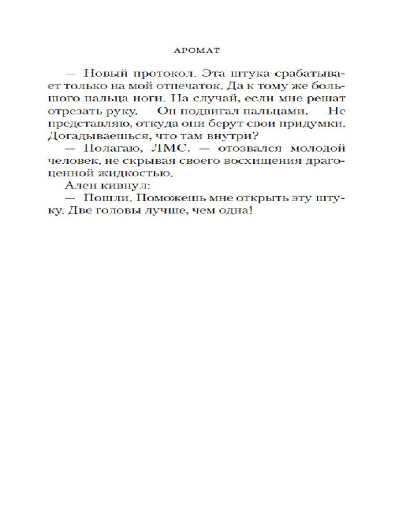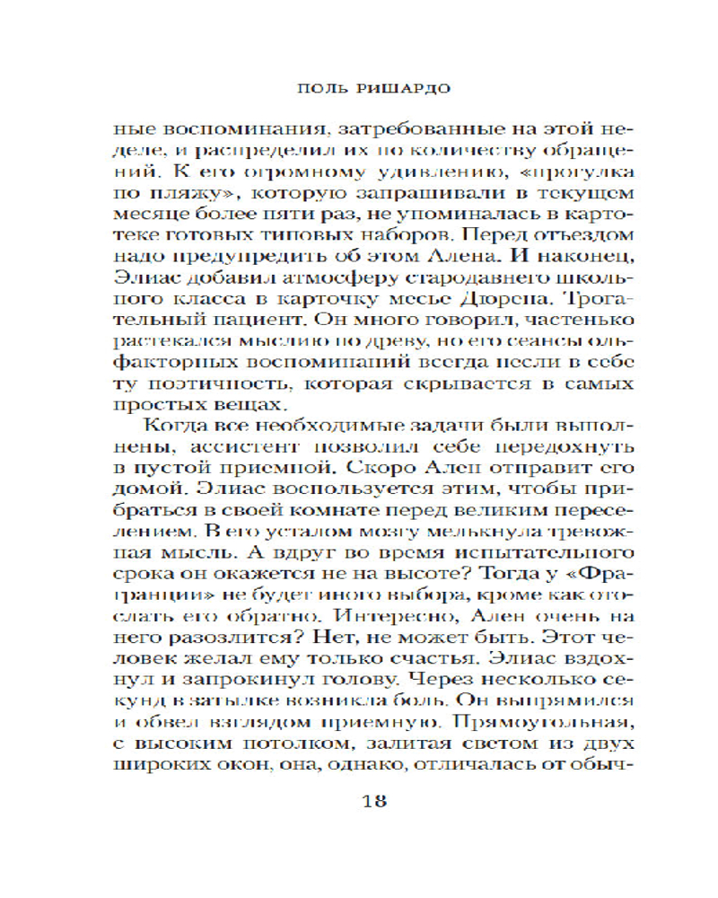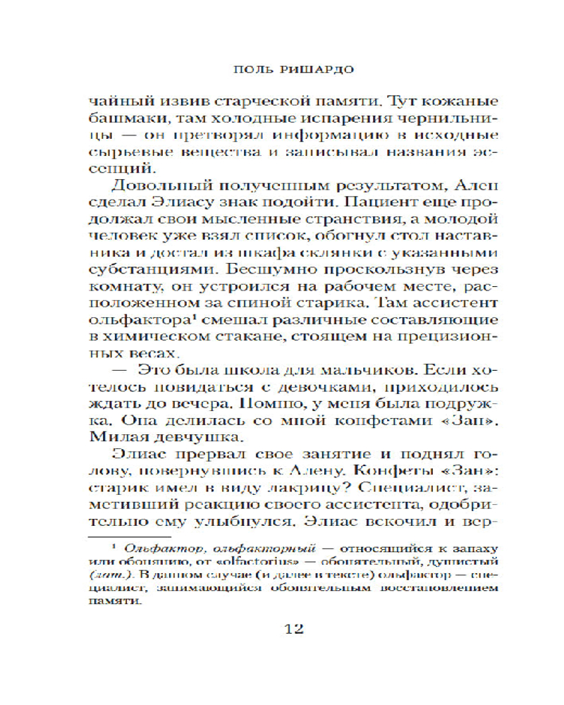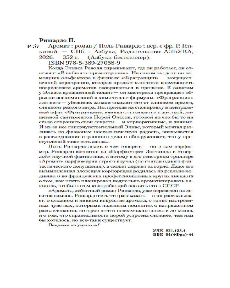 Поль Ришардо знает, о чем говорит, — он и сам парфюмер. В его сенсорном триллере «Аромат», уже переведенном на десяток языков, парфюмерия строго научна (не считая одного фантастического допущения), а сюжет держит за горло. Ришардо есть что рассказать — и он рассказывает: о сложном и дивном искусстве аромата, о тонко настроенных чувствах, которыми наделены немногие, о напряженном расследовании, которое почти невозможно довести до конца, и о том, что справедливость порой устроена сложнее, чем нам бы хотелось, — и все-таки существует.