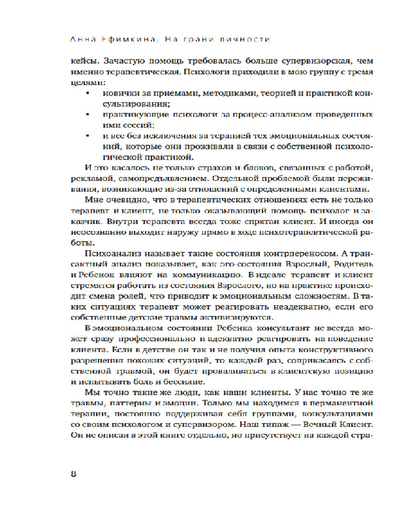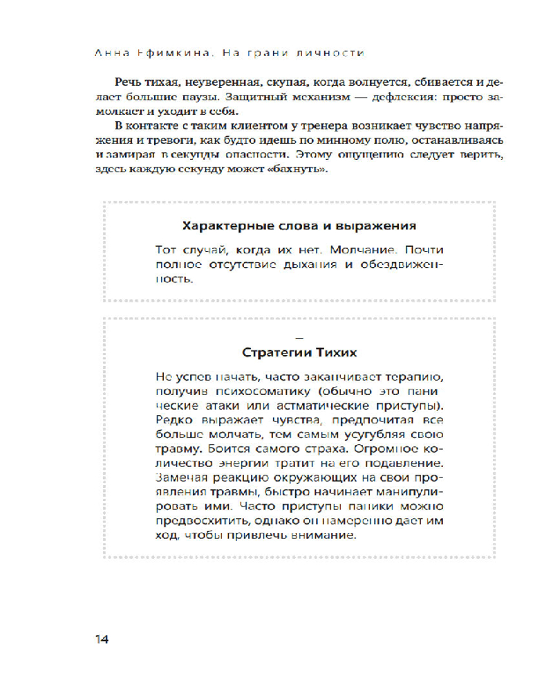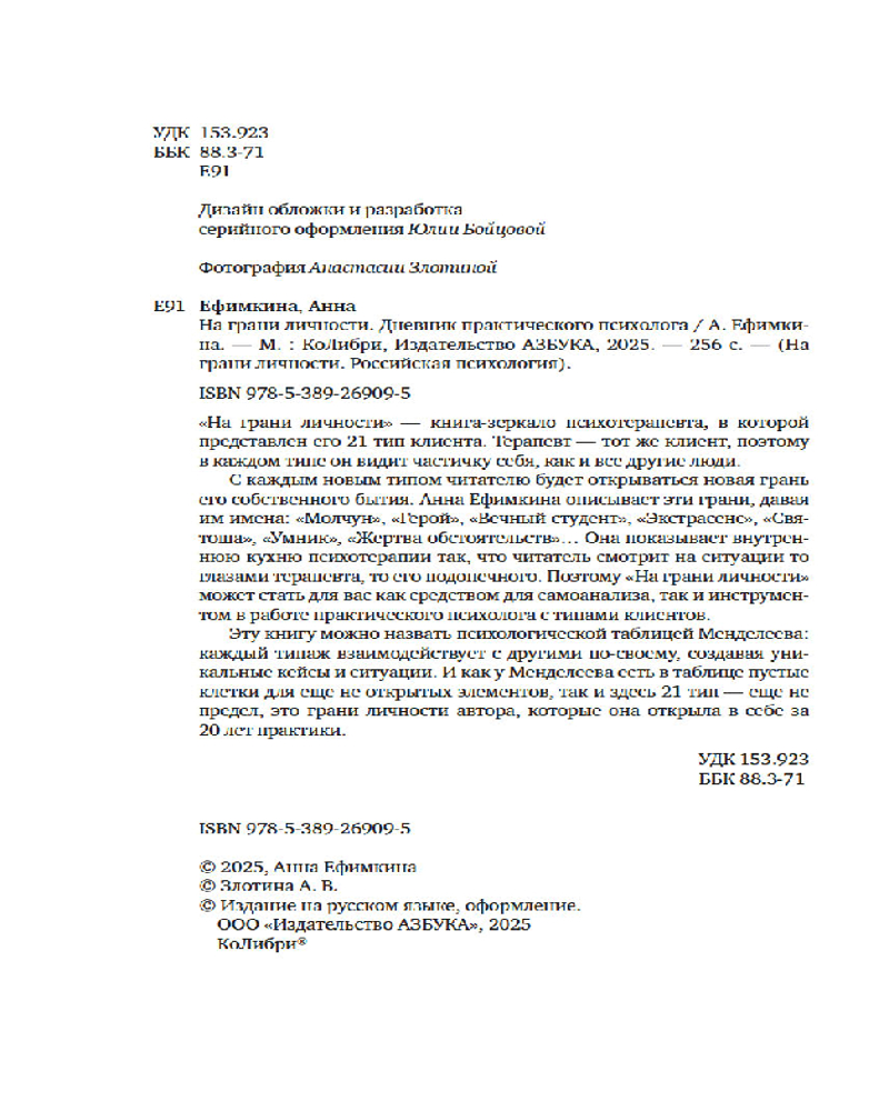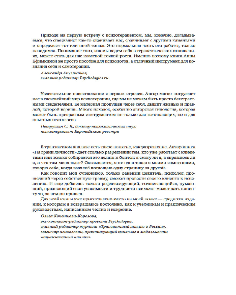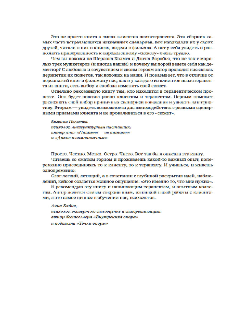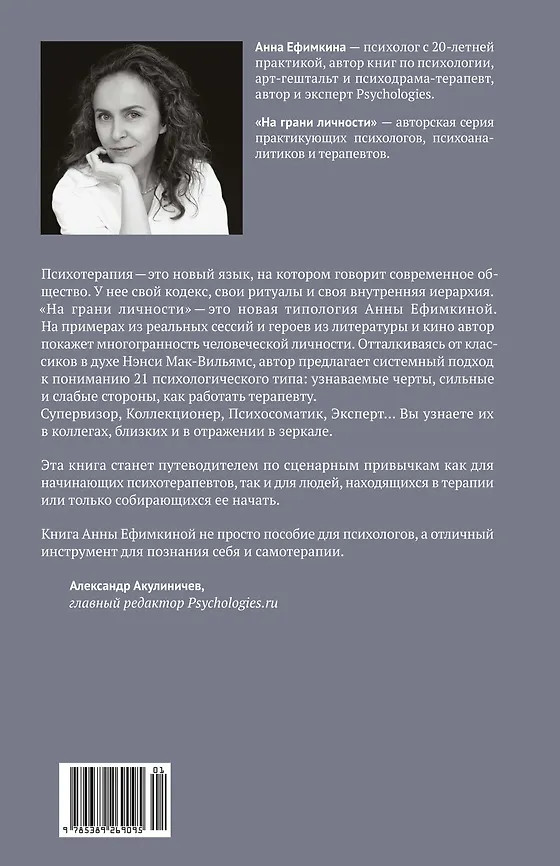 💳 Оплатить за товар можно при получении 🇰🇿 Есть бесплатная доставка по Казахстану от 1 дня 🎁 Копите бонусы с каждой покупки Серия: На грани личности. Дневник практического психолога Психотерапия — это новый язык, на котором говорит современное общество. У нее свой кодекс, свои ритуалы и своя внутренняя иерархия. «На грани личности» — это новая типология Анны Ефимкиной. На примерах из реальных сессий и героев из литературы и кино автор покажет многогранность человеческой личности. Отталкиваясь от классиков в духе Нэнси Мак-Вильямс, автор предлагает системный подход к пониманию 21 психологического типа: узнаваемые черты, сильные и слабые стороны, как работать терапевту. Супервизор, Коллекционер, Психосоматик, Эксперт... Вы узнаете их в коллегах, близких и в отражении в зеркале. Эта книга станет путеводителем по сценарным привычкам как для начинающих психотерапевтов, так и для людей, находящихся в терапии или только собирающихся ее начать. |