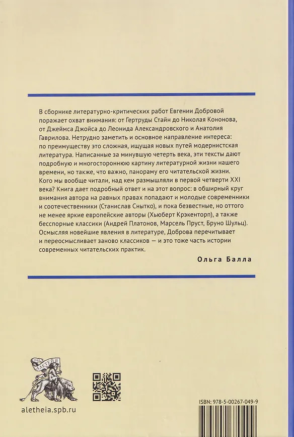 💳 Оплатить за товар можно при получении 🇰🇿 Есть бесплатная доставка по Казахстану от 1 дня 🎁 Копите бонусы с каждой покупки В сборнике литературно-критических работ Евгении Добровой поражает охват внимания: от Гертруды Стайн до Николая Кононова, от Джеймса Джойса до Леонида Александровского и Анатолия Гаврилова. Нетрудно заметить и основное направление интереса: по преимуществу это сложная, ищущая новых путей модернистская литература. Написанные за минувшую четверть века, эти тексты дают подробную и многостороннюю картину литературной жизни нашего времени, но также, что важно, панораму его читательской жизни. Кого мы вообще читали, над кем размышляли в первой четверти ХХІ века? Книга дает подробный ответ и на этот вопрос: в обширный круг внимания автора на равных правах попадают и молодые современники, и соотечественники (Станислав Снытко), и пока безвестные, но оттого не менее яркие европейские авторы (Хьюберт Крэкенторп), а также бесспорные классики (Андрей Платонов, Марсель Пруст, Бруно Шульц). Осмысливая новейшие явления в литературе, Доброва перечитывает и переосмысливает заново классиков, и это тоже часть истории современных читательских практик. |