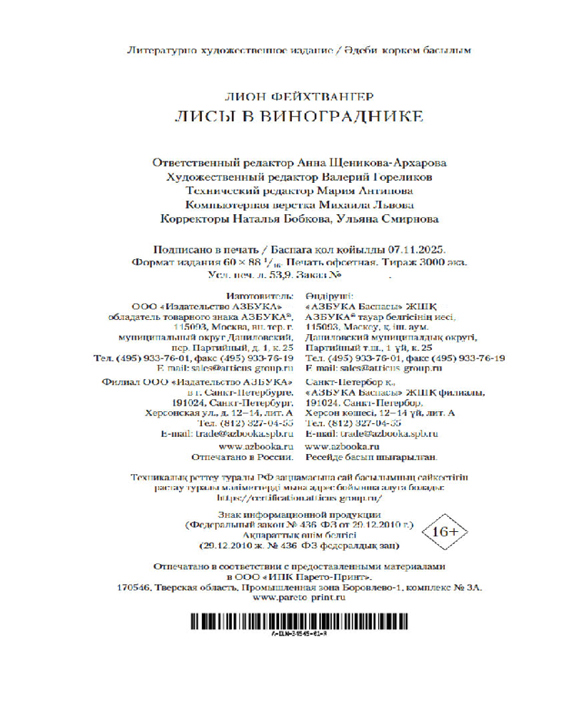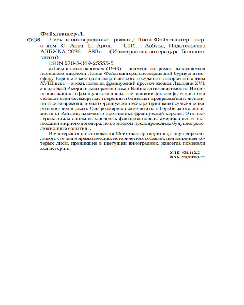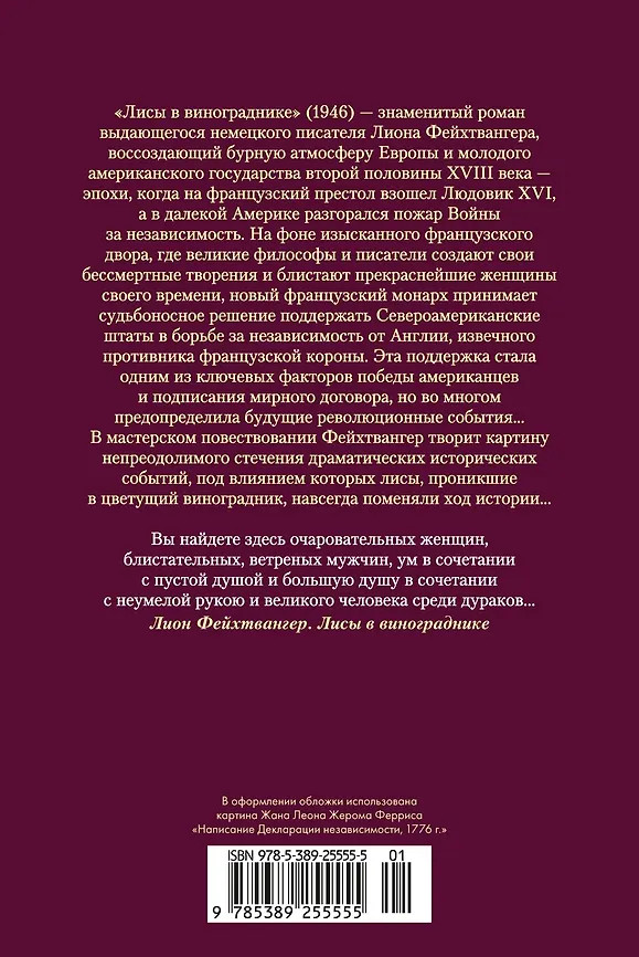 💳 Оплатить за товар можно при получении 🇰🇿 Есть бесплатная доставка по Казахстану от 1 дня 🎁 Копите бонусы с каждой покупки Серия: Иностранная литература. Большие книги «Лисы в винограднике» (1946) — знаменитый роман выдающегося немецкого писателя Лиона Фейхтвангера, воссоздающий бурную атмосферу Европы и молодого Американского государства второй половины XVIII века — эпохи, когда на французский престол взошел Людовик XVI, а в далекой Америке разгорался пожар Войны за независимость. На фоне изысканного французского двора, где великие философы и писатели создают свои бессмертные творения и блистают прекраснейшие женщины своего времени, новый французский монарх принимает судьбоносное решение поддержать Североамериканские штаты в борьбе за независимость от Англии, извечного противника французской короны. Эта поддержка стала одним из ключевых факторов победы американцев и подписания мирного договора, но во многом предопределила будущие революционные события... Книга станет прекрасным подарком любителям исторических романов, литературы XX века и поклонникам творчества Лиона Фейхтвангера. |