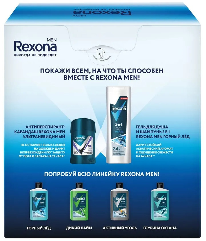 Сразу после душа нанесите антиперспирант Rexona Men Ультраневидимый в формате карандаш. Он эффективен от пота и запаха до 72 часов благодаря усиленной формуле для непревзойденной защиты. Технология Motionsense активируется при движении, сохраняя свежесть и абсолютный комфорт на весь день. Микрочастицы создают дышащую микропленку для надежной защиты от пота и запаха. Потовые железы блокируются частично, кожа при этом дышит. Больше движений — больше уверенности! Формула антиперспиранта содержит меньше солей алюминия — основной причины белых пятен. Антиперспирант можно использовать при ношении любой одежды, ведь он не оставляет следов и бережно воздействует на ткань. Элегантный мужественный аромат с древесными нотками сидит близко к телу, приятен при нанесении и не перебивает аромат вашего парфюма. Особенно подарочный набор порадует тех, кто ведет активную жизнь.