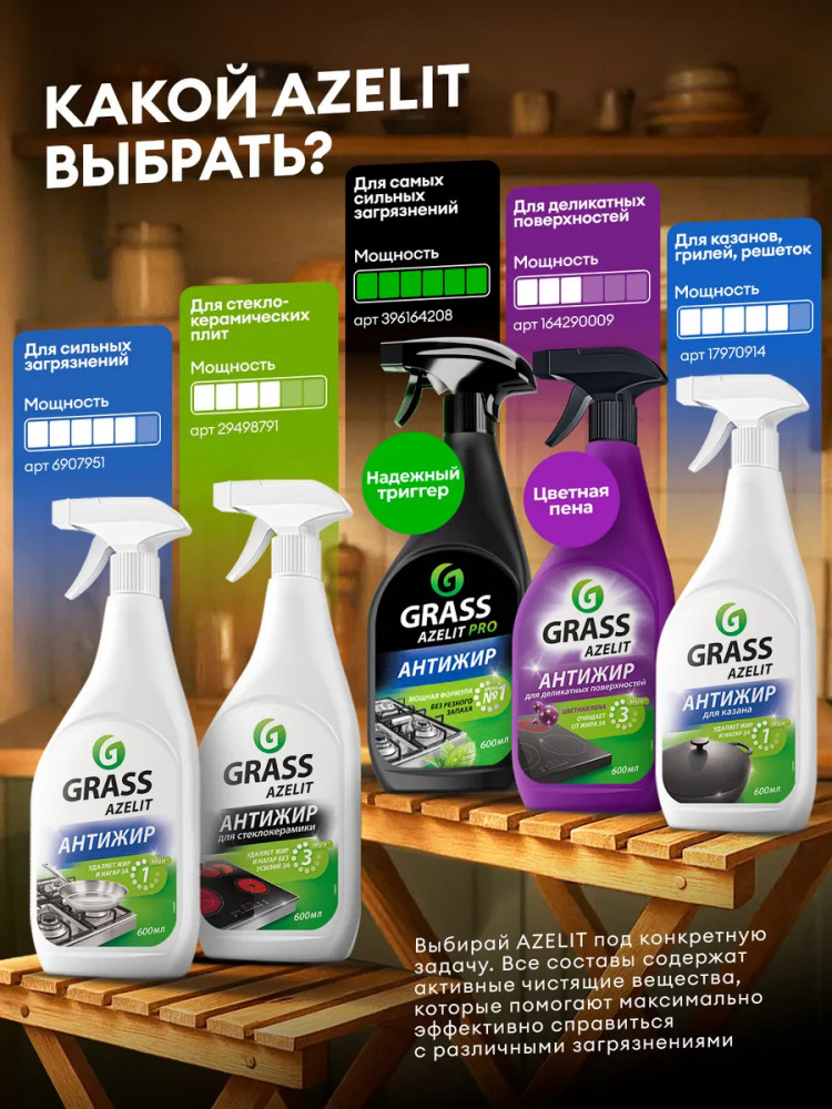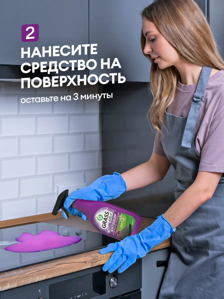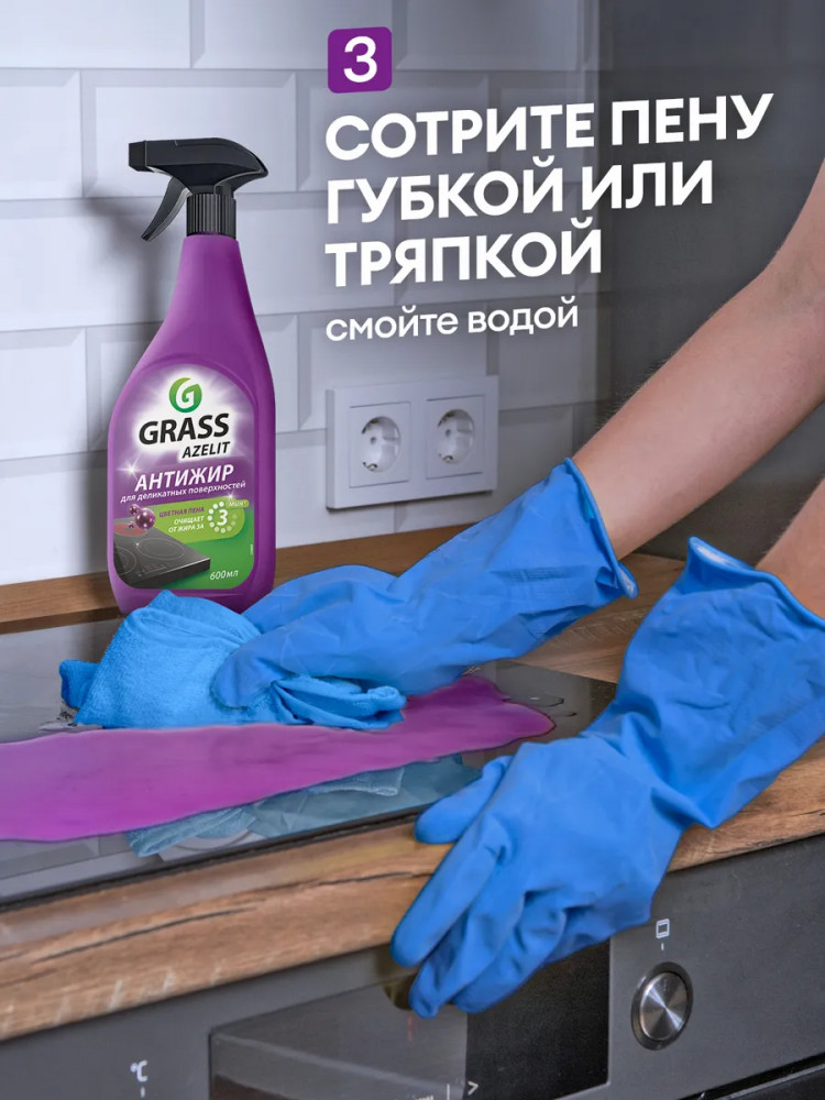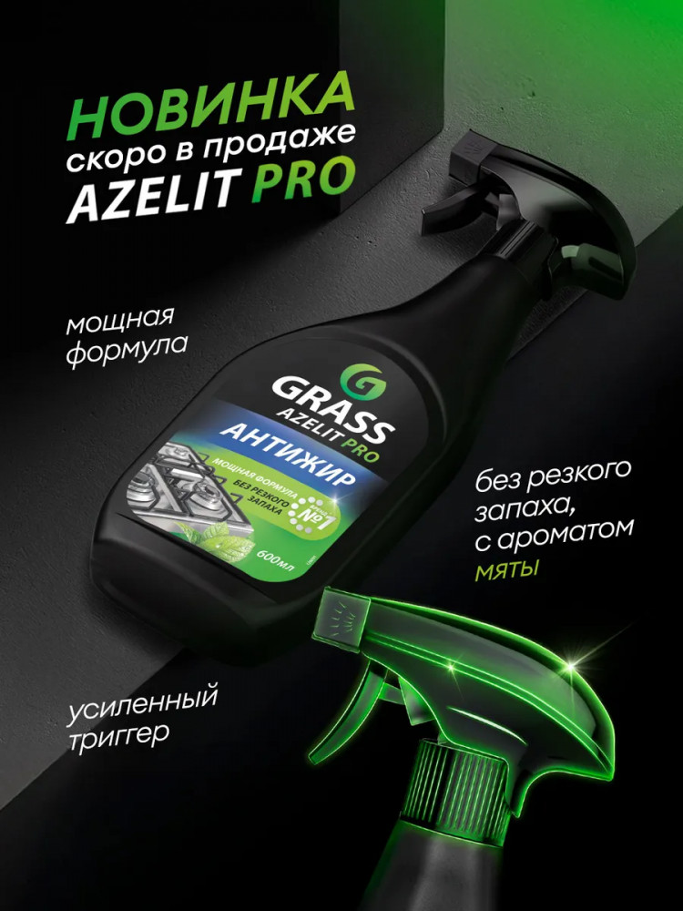 Средство-жироудалитель от Grass — ваше идеальное решение для устранения жира и сажи на вашей кухне. Специально разработанный компанией Grass, этот спрей для очистки кухни от жира Azelit предназначен для эффективной очистки различных кухонных приборов, подходит для уборки стеклокерамических и индукционных плит, духовых шкафов, грилей, микроволновых печей, кастрюль, сковородок и прочих приборов для приготовления пищи. Создавая активную цветную пену спрей антижир деликатно очищает поверхности из стекла, керамики, фаянса, нержавеющей стали, алюминия, тефлоновых, оцинкованных, хромированных, медных, а так же изделий из пластика и цветных металлов. Подходит для уборки кухонных фасадов, фартуков, силиконовых и резиновых уплотнителей.