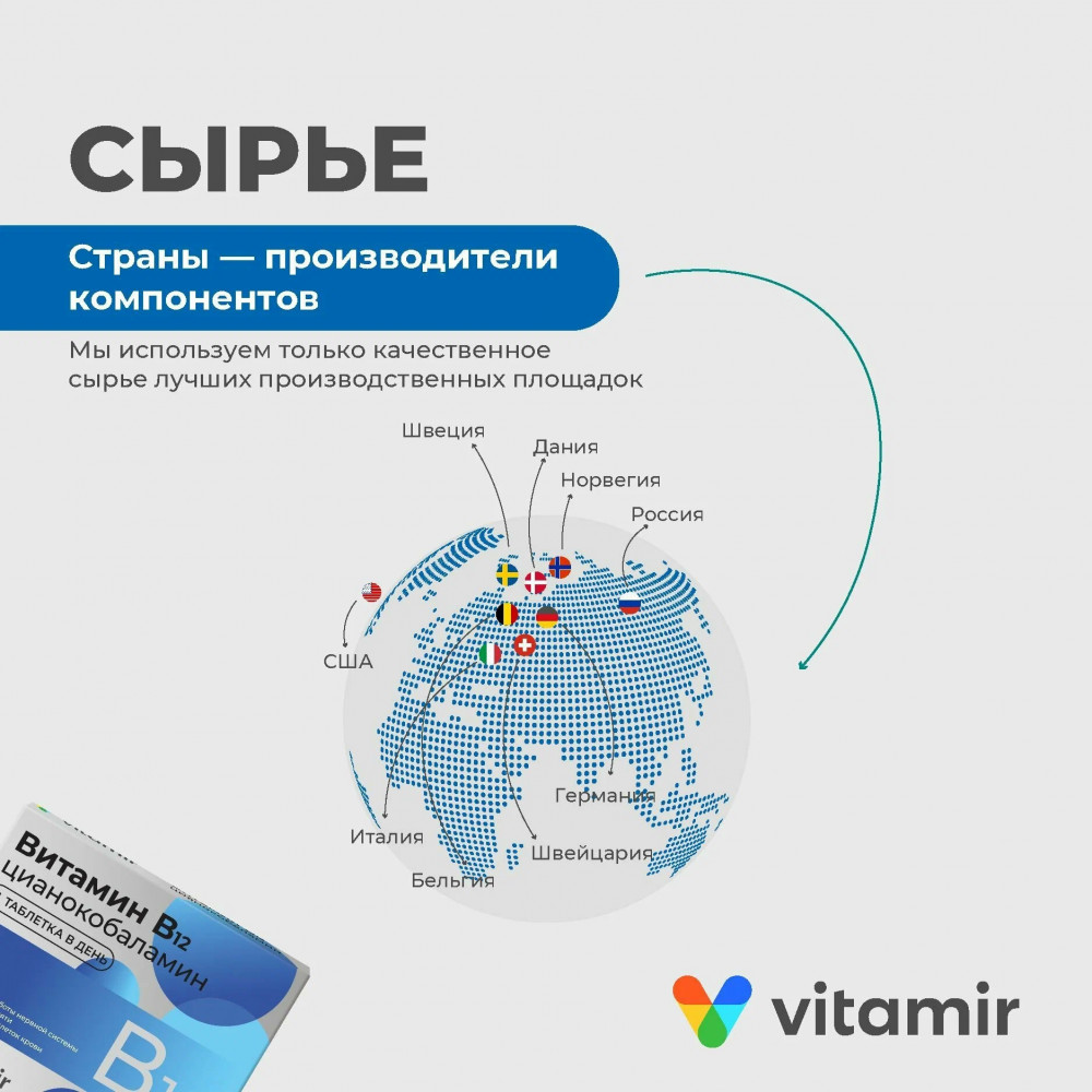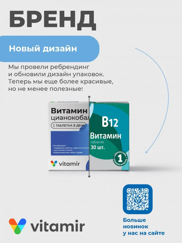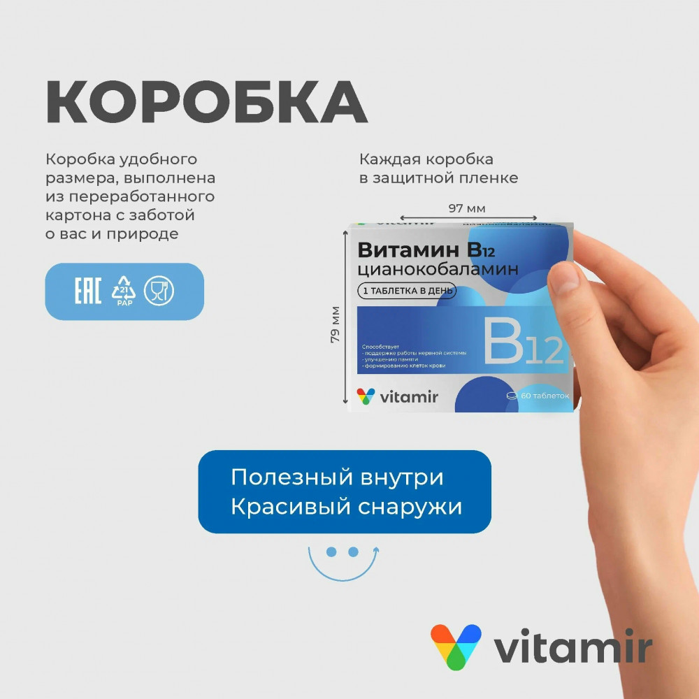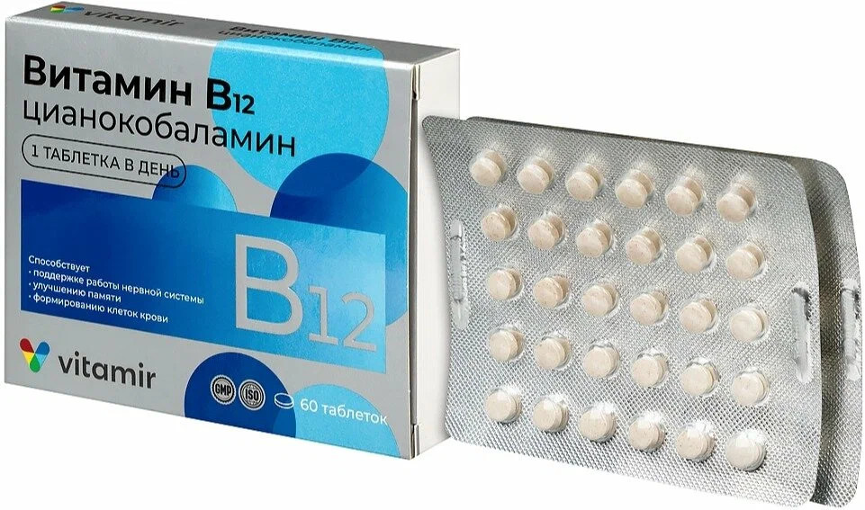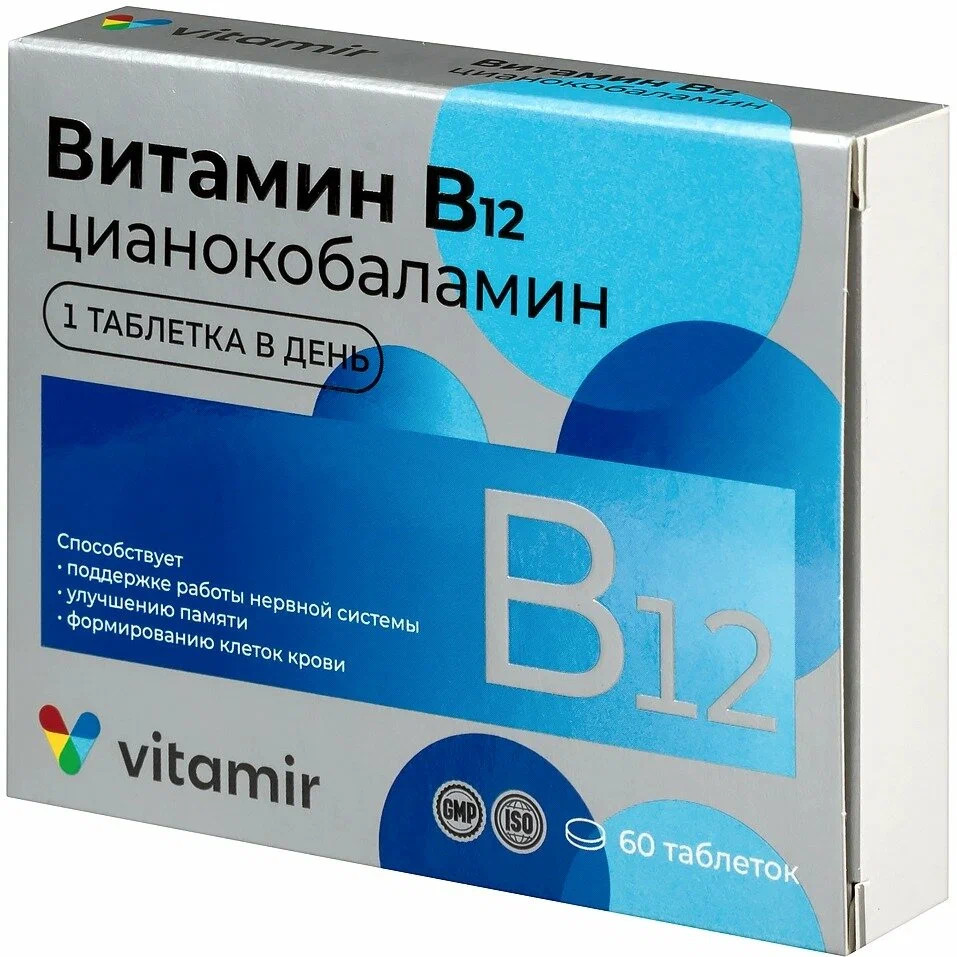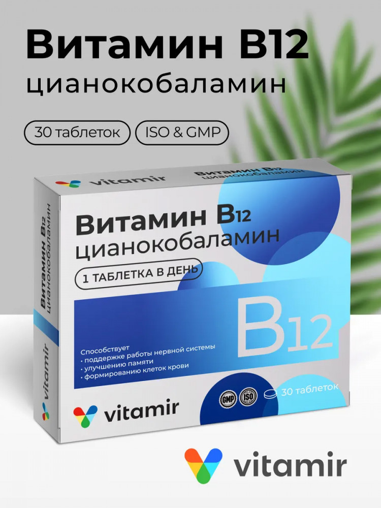 Витамин В12 для нервной системы и улучшения работоспособности мозга № 30 (VITAMIR). Основные действия: поддерживает работу нервной системы, улучшает память и работу мозга, снижает усталость и утомляемость. В 1934 году за открытие биологически активных свойств витамина В12 два гарвардских врача Уильям Парри Мёрфи и Джордж Майкот получили Нобелевскую премию. Витамин B12 (цианокобаламин) является одним из самых важных во всей группе витаминов В. Он играет особую роль в поддержании здоровья и нормального функционирования головного мозга, нервной системы и формировании кровяных клеток.