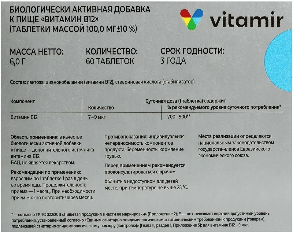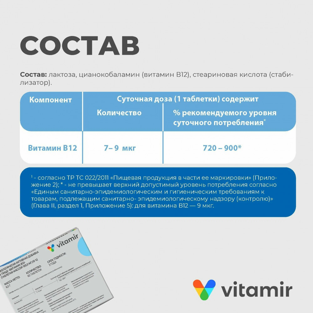 Суточная доза (1 таблетка) содержит: Витамин В12 — 7 — 9.