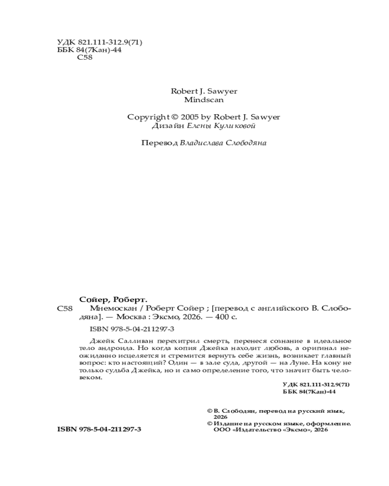 💳 Оплатить за товар можно при получении 🇰🇿 Есть бесплатная доставка по Казахстану от 1 дня 🎁 Копите бонусы с каждой покупки Серия: Fanzon. Роберт Сойер. Образы будущего Джейку Салливану удается обмануть смерть. Столкнувшись со смертельной болезнью, он переносит свое сознание в тело андроида, что гарантирует ему фактическое бессмертие. То же самое делают и другие миллиардеры. Благодаря новой процедуре мнемосканирования они отправляют свои устаревшие и обреченные людские оболочки в роскошный центр на обратной стороне Луны, а сами остаются на Земле в новых телах. Но не все идет по плану. Хотя новый мнемоскан Джейк находит любовь, недоступную ему ранее, его возлюбленная сталкивается с судебным процессом: ее сын отказывается признать мнемоскан тем же человеком, что и прототип, и требует наследство. Тем временем на Луне биологический Джейк, благодаря достижениям медицинской нанотехнологии, исцеляется от своей болезни и решает вернуться. Кто теперь настоящий? Кто обладает правами личности — биологический оригинал или копия, которой он сам их уступил? И что значит быть человеком? |