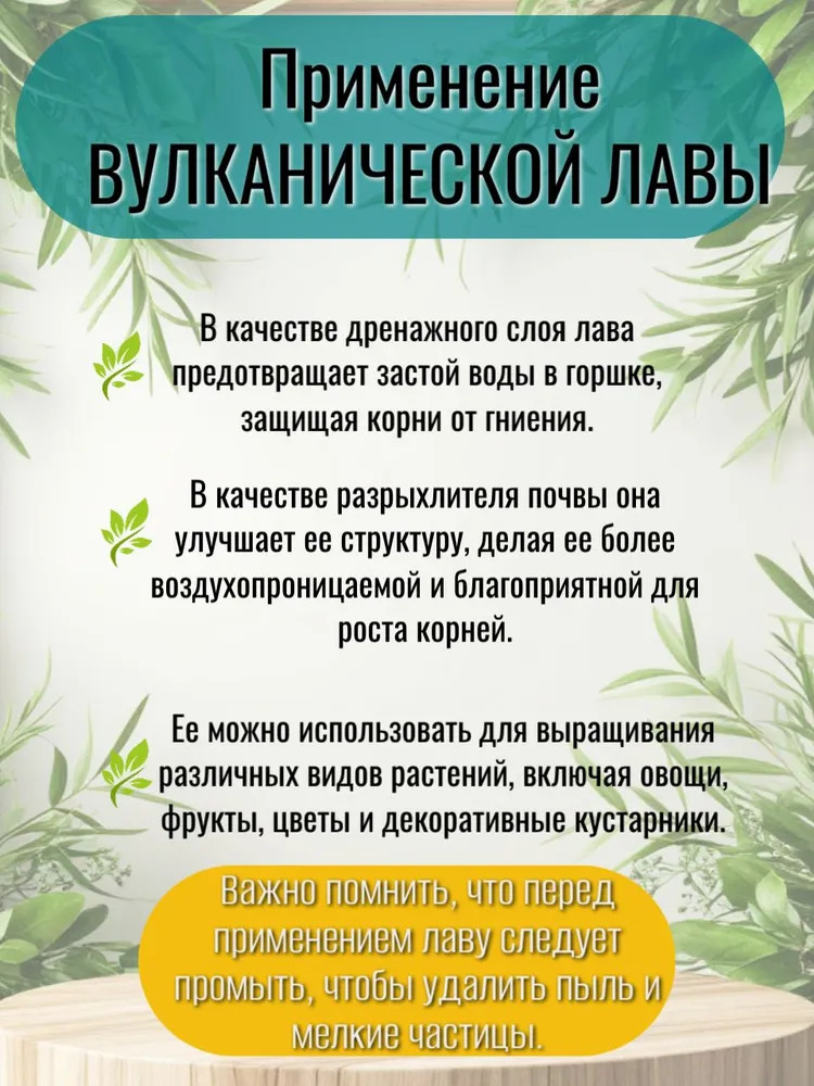 Используется в качестве разрыхлителя почвы она улучшает ее структуру, делая ее более воздухопроницаемой и благоприятной для роста корней. А в декоративных целях лава придает контейнерным садам и аквариумам неповторимый вид, имитируя природные ландшафты. Применение вулканической лавы в качестве компонента почвенных смесей или мульчирующего материала способствует улучшению плодородия почвы и стимулирует развитие корневой системы растений. Ее можно использовать для выращивания различных видов растений, включая овощи, фрукты, цветы и декоративные кустарники. Важно помнить, что перед применением лаву следует промыть, чтобы удалить пыль и мелкие частицы.