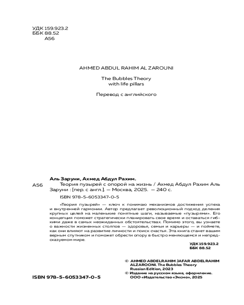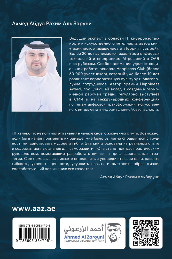 💳 Оплатить за товар можно при получении 🇰🇿 Есть бесплатная доставка по Казахстану от 1 дня 🎁 Копите бонусы с каждой покупки Серия: Говорят эксперты. Практичные книги от специалистов своего дела Мы часто ставим перед собой большие цели — и так же часто откладываем их, потому что они кажутся слишком сложными, пугающими или недостижимыми. «Теория пузырей» предлагает иной, практичный и человечный подход к жизни и успеху. Ахмед Аль Заруни показывает, как разделять любую большую цель на небольшие, понятные шаги — «пузыри», с которыми можно работать последовательно и без перегрузки. Такой метод помогает сохранять фокус, гибкость и устойчивость даже в условиях неопределенности и кризисов. В книге вы найдете не только инструмент планирования, но и целостную систему жизни: столпы здоровья, разума, семьи, карьеры, финансов, культуры и привычек, на которые можно опереться в быстро меняющемся мире. Это книга о стратегии, ответственности за свою жизнь и умении двигаться вперед. |