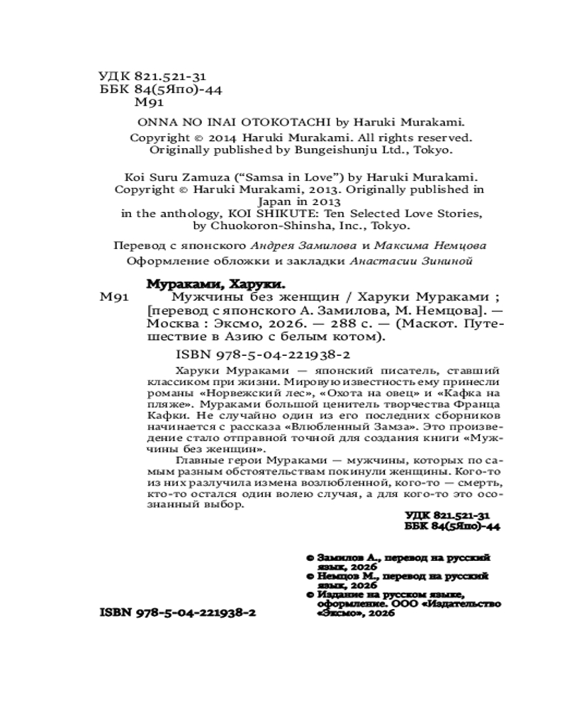 💳 Оплатить за товар можно при получении 🇰🇿 Есть бесплатная доставка по Казахстану от 1 дня 🎁 Копите бонусы с каждой покупки Серия: Маскот. Путешествие в Азию с белым котом Харуки Мураками — японский писатель, ставший классиком при жизни. Мировую известность ему принесли романы «Норвежский лес», «Охота на овец» и «Кафка на пляже». Мураками большой ценитель творчества Франца Кафки. Не случайно один из его последних сборников начинается с рассказа «Влюбленный Замза». Это произведение стало отправной точкой для создания книги «Мужчины без женщин». Главные герои Мураками — мужчины, которых по самым разным обстоятельствам покинули женщины. Кого-то из них разлучила измена возлюбленной, кого-то — смерть, кто-то остался один волею случая, а для кого-то это осознанный выбор. |