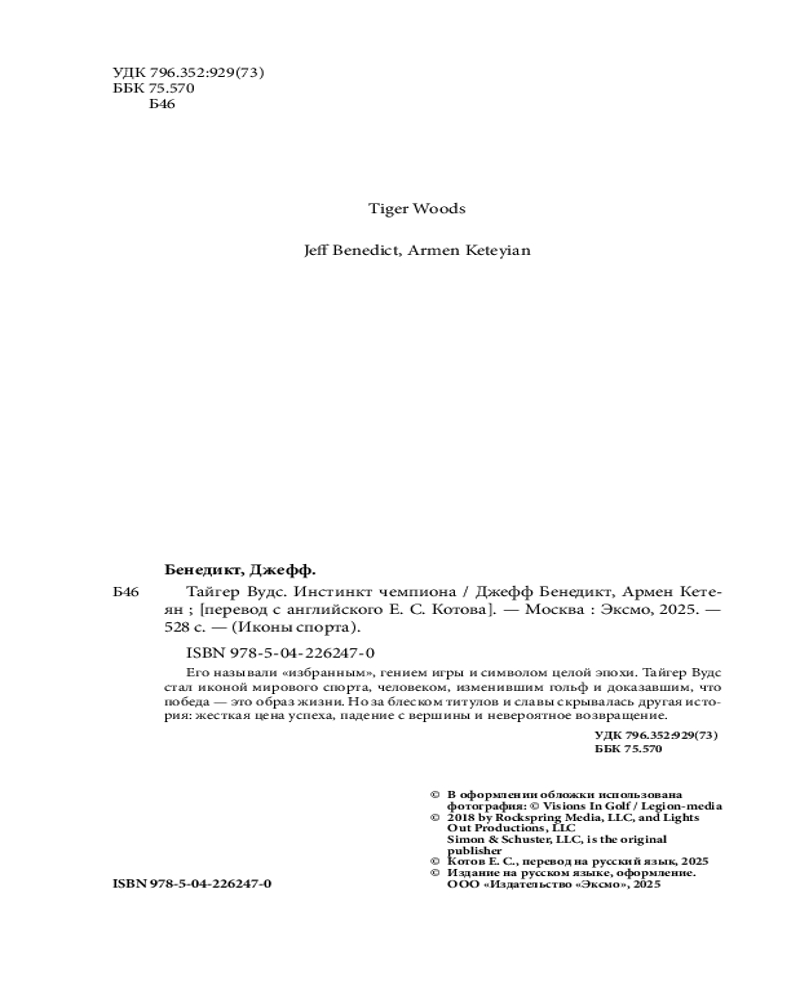 💳 Оплатить за товар можно при получении 🇰🇿 Есть бесплатная доставка по Казахстану от 1 дня 🎁 Копите бонусы с каждой покупки Серия: Иконы спорта Его называли «избранным», гением игры и символом целой эпохи. Тайгер Вудс стал иконой мирового спорта, человеком, изменившим гольф и доказавшим, что победа — это образ жизни. Но за блеском титулов и славы скрывалась другая история: жесткая цена успеха, падение с вершины и невероятное возвращение. Эта биография — результат сотен интервью и многолетнего расследования. |