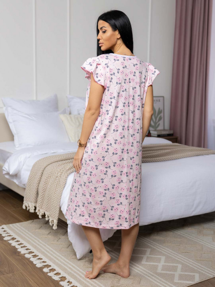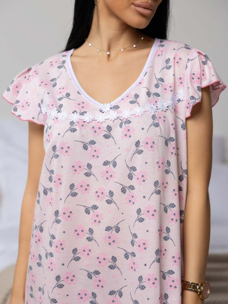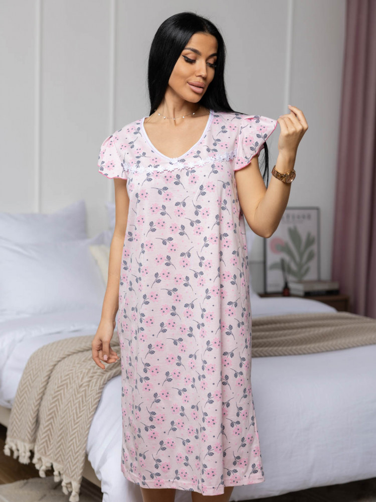 Женская ночная сорочка из хлопка, длиной ниже колена, с рукавом воланом и V-образной горловиной, украшена кружевом. Материал приятный к телу, обеспечивает комфорт во время сна. Изделие разработано с учётом комфорта и практичности.