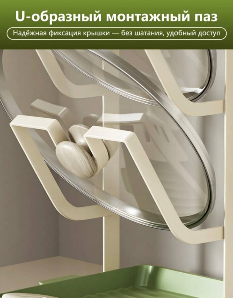 • экономит пространство на столешнице и в шкафах — крышки больше не нужно складывать стопками или искать подходящее место, вертикальное хранение освобождает рабочую зону и делает кухню визуально аккуратной;