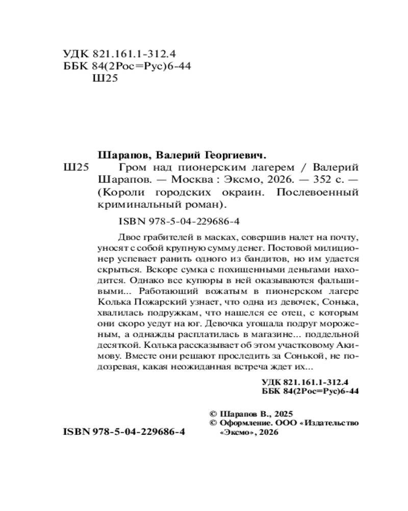 💳 Оплатить за товар можно при получении 🇰🇿 Есть бесплатная доставка по Казахстану от 1 дня 🎁 Копите бонусы с каждой покупки Серия: Короли городских окраин. Послевоенный криминальный роман (обложка) Двое грабителей в масках, совершив налет на почту, уносят с собой крупную сумму денег. Постовой милиционер успевает ранить одного из бандитов, но им удается скрыться. Вскоре сумка с похищенными деньгами находится. Однако все купюры в ней оказываются фальшивыми... Работающий вожатым в пионерском лагере Колька Пожарский узнает, что одна из девочек, Сонька, хвалилась подружкам, что нашелся ее отец, с которым они скоро уедут на юг. Девочка угощала подруг мороженым, а однажды расплатилась в магазине... поддельной десяткой. Колька рассказывает об этом участковому Акимову. Вместе они решают проследить за Сонькой, не подозревая, какая неожиданная встреча ждет их... |