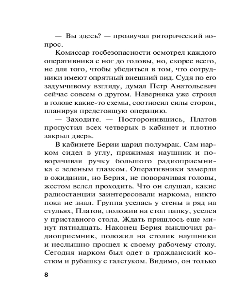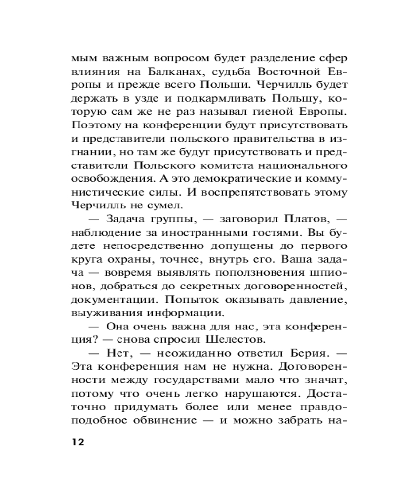 💳 Оплатить за товар можно при получении 🇰🇿 Есть бесплатная доставка по Казахстану от 1 дня 🎁 Копите бонусы с каждой покупки Серия: Спецназ Берии. Герои секретной войны (обложка) Конец 1944 года. Представители стран антигитлеровской коалиции собираются на Четвертую Московскую конференцию, чтобы обсудить будущее мироустройство. Одновременно это подходящая возможность «прозондировать почву», выяснить намерения союзников, добыть чужие секреты. Чтобы пресечь утечку информации, на встречу глав государств направляется группа подполковника Максима Шелестова. Но ее приезд омрачается неожиданным происшествием. В самом центре Москвы один из подчиненных Шелестова, Виктор Буторин, становится свидетелем убийства неизвестного гражданина. Видел Буторин и убегавшего преступника. Наши агенты еще не знали, что именно с этим человеком им придется столкнуться в кулуарах конференции при очень странных обстоятельствах... |