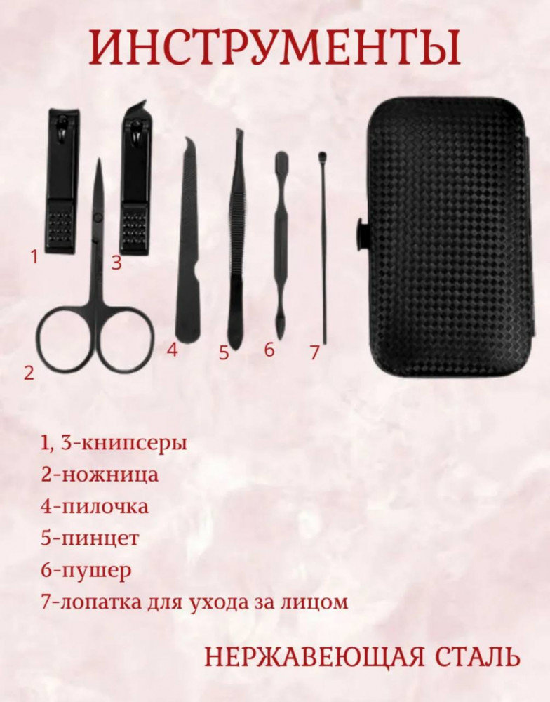 💳 Оплатить за товар можно при получении 🇰🇿 Есть бесплатная доставка по Казахстану от 1 дня 🎁 Копите бонусы с каждой покупки Компактный маникюрный набор из 7 предметов — идеальное решение для ухода за ногтями дома и в дороге. Все инструменты выполнены из прочного металла с матовым покрытием, аккуратно размещены в удобном защитном чехле. Набор подходит как для женщин, так и для мужчин, а также станет отличным подарком. |