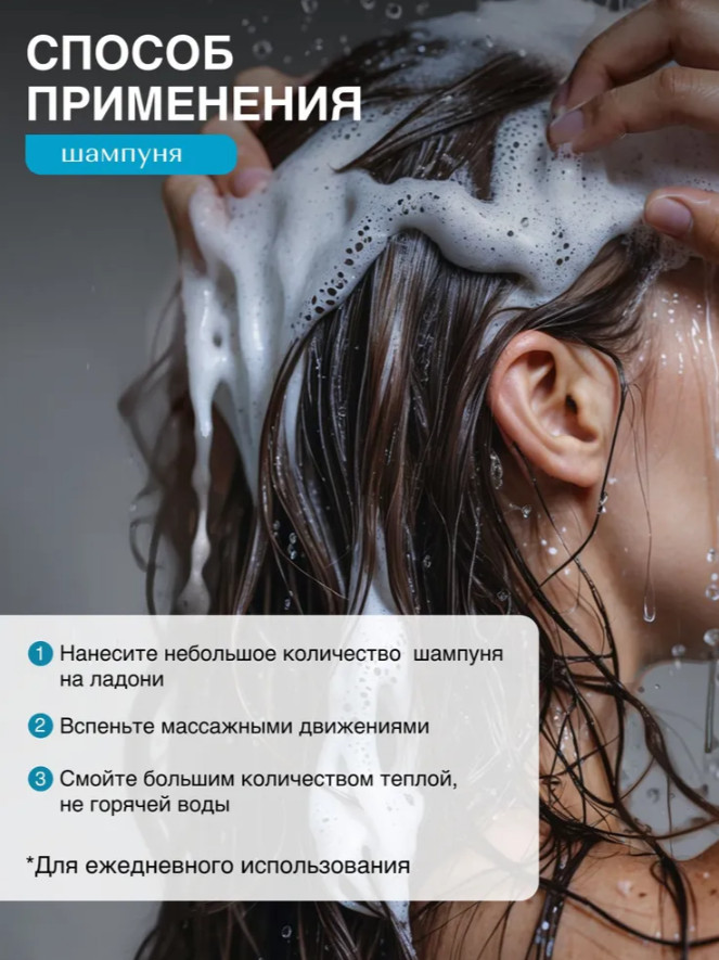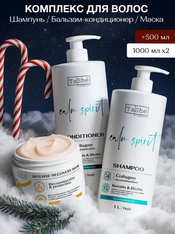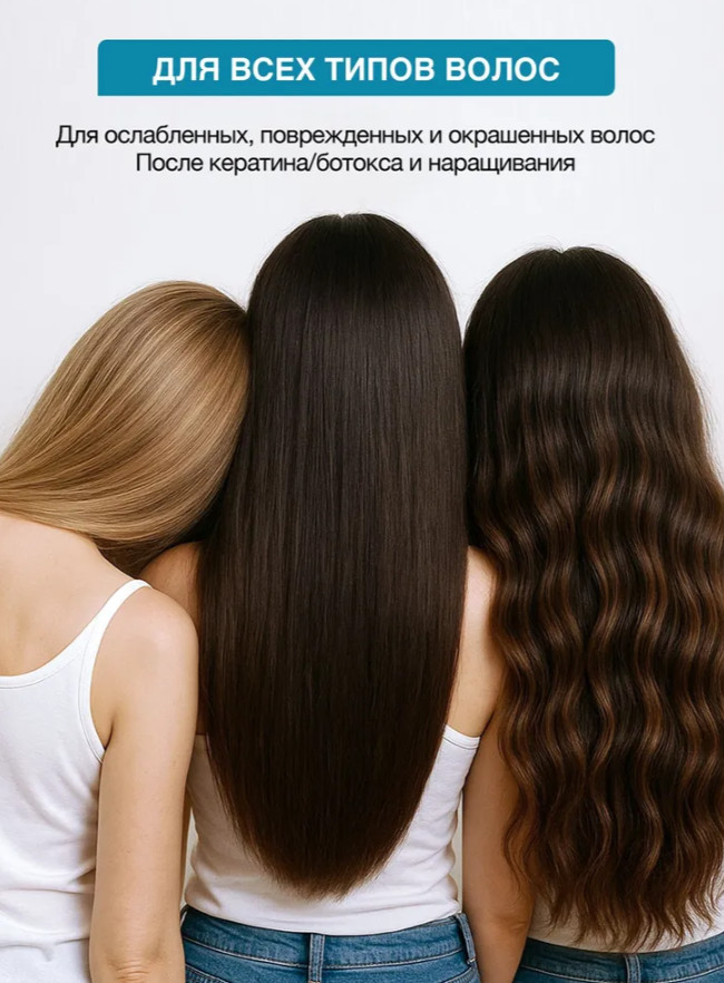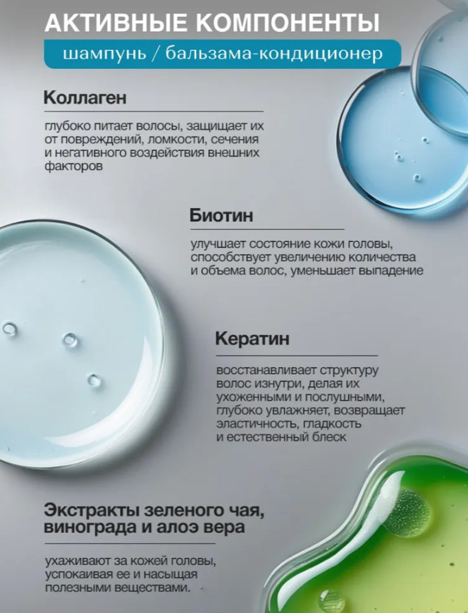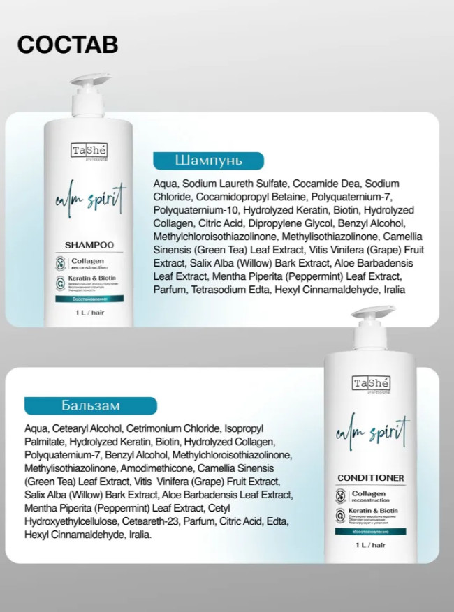 Шампунь: Aqua; Sodium laureth sulfate; Cocamide DEA; Sodium Chloride; Cocamidopropyl Betaine; Polyquaternium-7; Polyquaternium-10; Hydrolyzed Keratin; Biotin; Hydrolyzed Collagen; Citric Acid; Dipropylene Glycol; Benzyl alcohol; Methylchloroisothiazolinone; Methylisothiazolinone; Camellia Sinensis (Green Tea) Leaf Extract; vitis vinifera (grape) fruit extract; Salix Alba (Willow) Bark Extract; Aloe Barbadensis Leaf Extract; Mentha Piperita (Peppermint) Leaf Extract; Parfum, Tetrasodium Edta, Hexyl Cinnamaldehyde, Iralia.