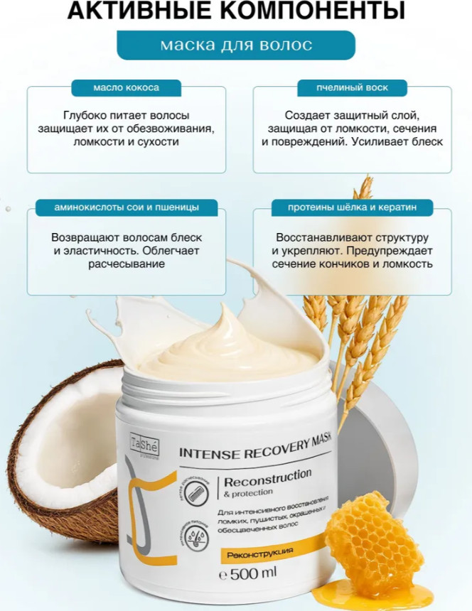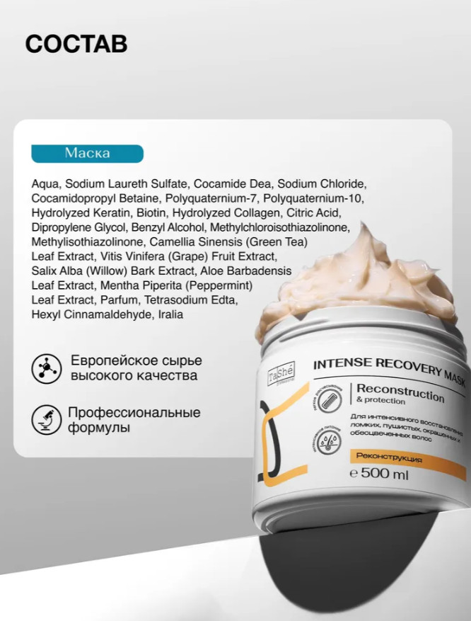 Маска: Aqua, Cetearyl Alcohol, Cetrimonium Chloride, Dimethicone, Paraffinum Liquidum, Behentrimonium Сhloride, Microcrystalline Wax, Hydrogenated Vegetable Oil, Beeswax, Hydrogenated Palm Acid, Stearyl Stearate, Glyceryl Stearate, Propylene Glycol, Cocos Nucifera Fruit Extract, Cocos Nucifera (Coconut) Oil, Hydrolyzed Keratin, Hydrolyzed Silk, Wheat Amino Acids, Soy Amino Acids, Arginine HCl, Serine, Threonine, Panthenol, Lactic Acid, Parfum, Benzyl Alcohol, Methylisothiazolinone, Methylchloroisothiazolinone, Benzyl Benzoate, Caramel.