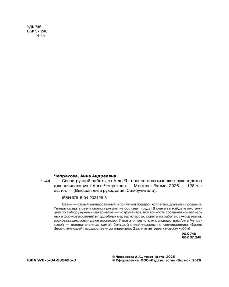 💳 Оплатить за товар можно при получении 🇰🇿 Есть бесплатная доставка по Казахстану от 1 дня 🎁 Копите бонусы с каждой покупки Серия: Высшая лига рукоделия. Самоучители Анна Чепракова — основательница самой большой онлайн-школы по свечеварению «Buono deco», имеющей государственную лицензию, и номинант премии GetAward 2024 в категории «Прорыв года» в нише хобби. Ее жизнь неразрывно связана со свечеварением уже более пяти лет, и она готова поделиться с вами всеми секретами создания самых красивых и ароматных изделий из воска. |