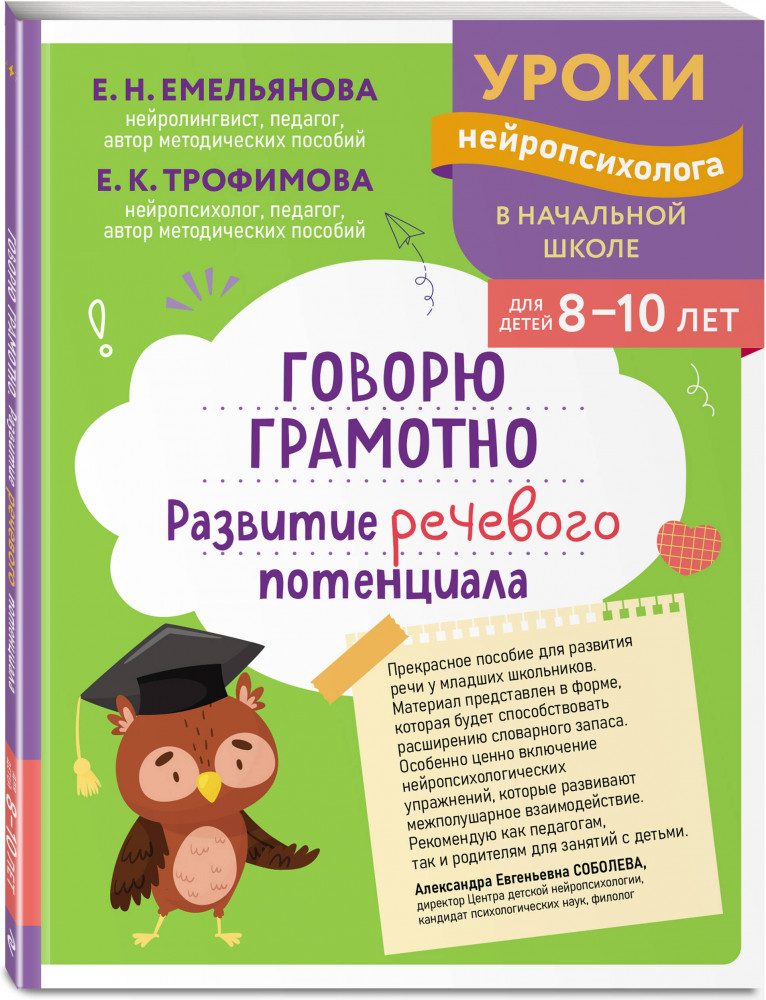 «Говорю грамотно» — книга для учеников начальной школы, которая превращает работу над речью в увлекательное путешествие по темам «Вода», «Воздух», «Горы», «Космос» и др. Ребёнок узнает, что такое синонимы и антонимы, научится согласовывать слова, составлять предложения и понимать переносные значения. Артикуляционные и двигательные упражнения активизируют работу речевых центров мозга, а постепенное усложнение материала гарантирует результат.