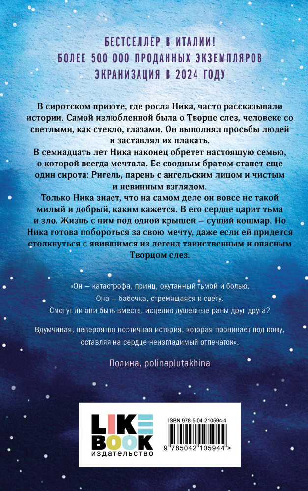 В сиротском приюте, где росла Ника, часто рассказывали истории. Самой излюбленной была о Творце слез, человеке со светлыми, как стекло, глазами. Он выполнял просьбы людей и заставлял их плакать. В семнадцать лет Ника наконец обретет настоящую семью, о которой всегда мечтала. Ее сводным братом станет еще один сирота: Ригель, парень с ангельским лицом и чистым и невинным взглядом. Только Ника знает, что на самом деле он вовсе не такой милый и добрый, каким кажется. В его сердце царят тьма и зло. Жизнь с ним под одной крышей — сущий кошмар. Но Ника готова побороться за свою мечту, даже если ей придется столкнуться с явившимся из легенд таинственным и опасным Творцом слез.