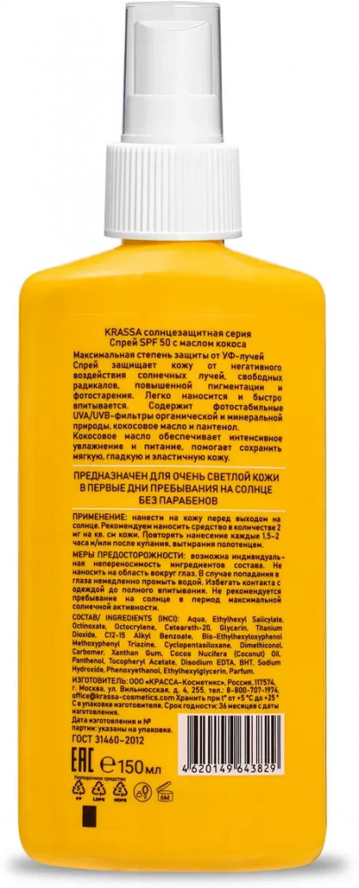 Krassa Спрей солнцезащитный SPF 50 с маслом кокоса