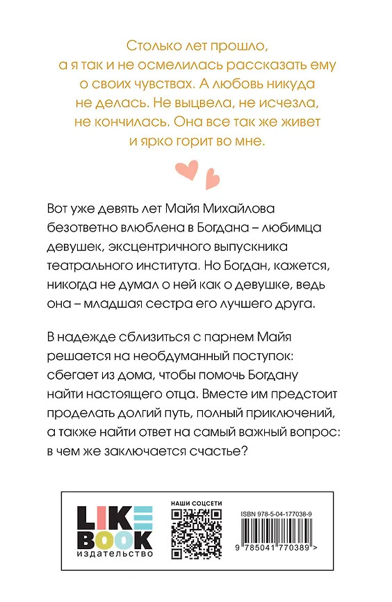 Вот уже девять лет Майя Михайлова безответно влюблена в Богдана — любимца девушек, эксцентричного выпускника театрального института. Но Богдан, кажется, никогда не думал о ней как о девушке, ведь она — младшая сестра его лучшего друга. В надежде сблизиться с парнем Майя решается на необдуманный поступок: сбегает из дома, чтобы помочь Богдану найти настоящего отца. Вместе им предстоит проделать долгий путь, полный приключений, а также найти ответ на самый важный вопрос: в чем же заключается счастье?