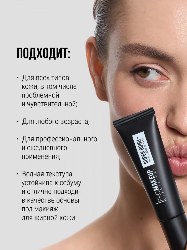 Инновационное средство на гелевой основе, которое усиливает сцепление любого средства декоративной косметики с кожей, и одновременно защищает кожу от потери влаги и обладает успокаивающим и восстанавливающим действием. Водная гелевая текстура основы максимально устойчива к себуму и отлично подходит для жирной кожи. Можно использовать как базу для век под сухие тени, рассыпчатые пигменты, слюду и глиттеры, использовать для фиксации глиттера на губах или других участках тела, а также в качестве базы под макияж на все лицо. Super Bond создает невидимую сеточку на поверхности, которая препятствует впитыванию цветных водостойких пигментов в кожу, что делает ее универсальным средством для использования под театральный грим. Грим, нанесенный на основу SUPER BOND держится дольше и легче снимается с кожи, так как для полного растворения основы необходим только контакт с теплой водой.