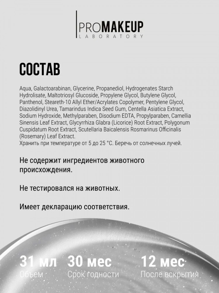 • арабиногалактан — природный полисахарид из лиственницы. Это высокофункциональный природный полимер, который образует эластичную и воздухопроницаемую фиксирующую пленку на коже. Препятствует испарению влаги из кожи, увлажняет и поддерживает здоровый микробиом кожи;