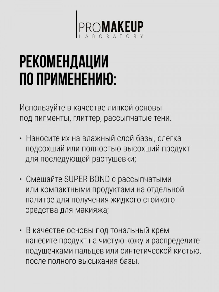 Внимание! Для максимальной фиксации основа наносится на сухую и чистую кожу. Любой кремовый продукт, нанесенный до основы, который содержит масла в составе, будет препятствовать сцеплению Super Bond с кожей. Используйте в качестве липкой основы под пигменты, глиттер, рассыпчатые тени. Для этого несите небольшое количество основы на сухую чистую кожу, дайте ей немного подсохнуть, до появления липкости, нанесите пигменты на липкий слой. Для растушевки теней или растяжки пигментов по основе Super Bond дайте ей полностью высохнуть на коже до исчезновения липкого слоя, а после наносите желаемый продукт. Смешайте Super Bond с рассыпчатыми или компактными продуктами на отдельной палитре для получения жидкого стойкого средства для макияжа.