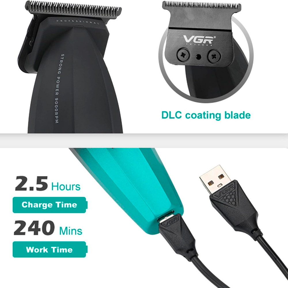 Лезвия из нержавеющей стали с технологией точного заточки обеспечивают гладкое скольжение и исключительную остроту, позволяя с легкостью справляться с волосами любого типа. Мощный мотор триммера VGR — 9000 об / мин гарантирует стабильную и надежную работу, а его низкий уровень шума и два режима работы (Стандарт / Турбо) делает процесс стрижки еще более комфортным как для клиента, так и для мастера.