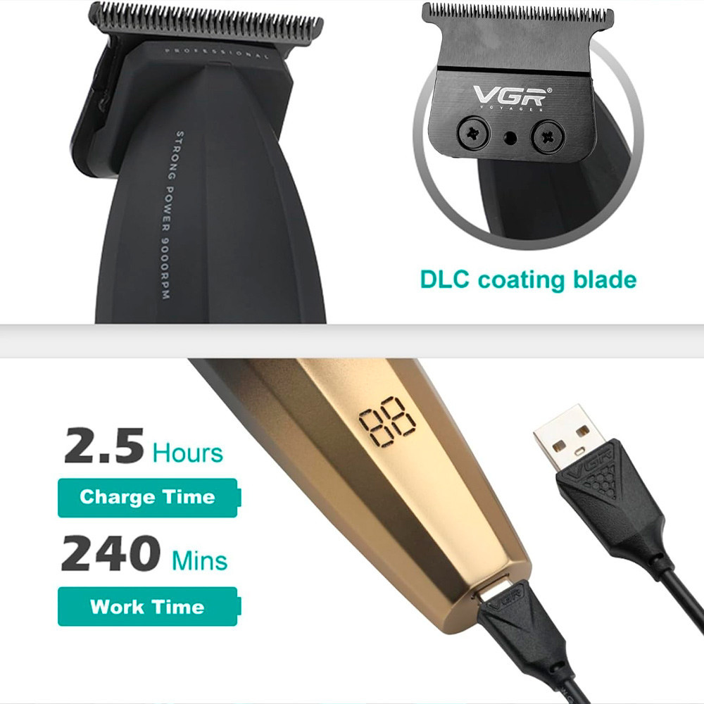 Лезвия из нержавеющей стали с технологией точного заточки обеспечивают гладкое скольжение и исключительную остроту, позволяя с легкостью справляться с волосами любого типа. Мощный мотор триммера VGR — 9000 об / мин гарантирует стабильную и надежную работу, а его низкий уровень шума и два режима работы (Стандарт / Турбо) делает процесс стрижки еще более комфортным как для клиента, так и для мастера.