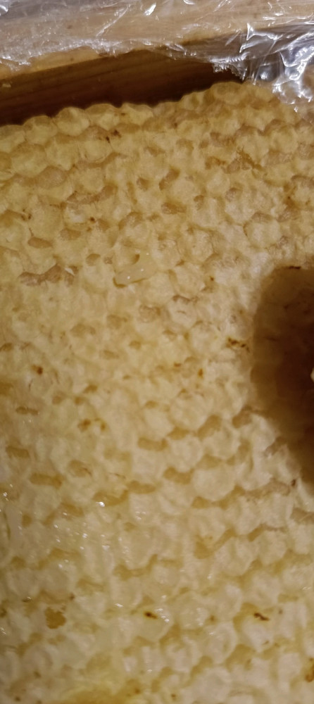 Это не натуральная сотовая рамка, извлеченная из улья, а собранная из запчастей. Это, в принципе, мед, когда-то выжатый из сот, нагретый до температуры плавления воска, смешанный воедино с добавлением загустителя, и заново залитый в подобие рамки. Доказательство? Если сделать ложкой срез, то внутри среза обнаружится ещё два этажа сот (разве будут пчелы строить соты, которые они замуруют вторым и третьим этажом? Рисунок сот не имеет общих границ и заполнен медовой прослойкой, не имеет специфического рисунка, свойственного сотам. В настоящей рамке соты строятся пчелами с двух наружных сторон (нет никаких внутренних этажей, а сами соты очень длинные). И...очень мало воска. Воск в натуральном сотовом мёде составляет не меньше 50% общей массы меда.