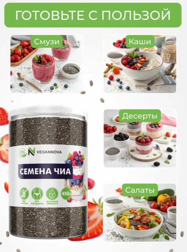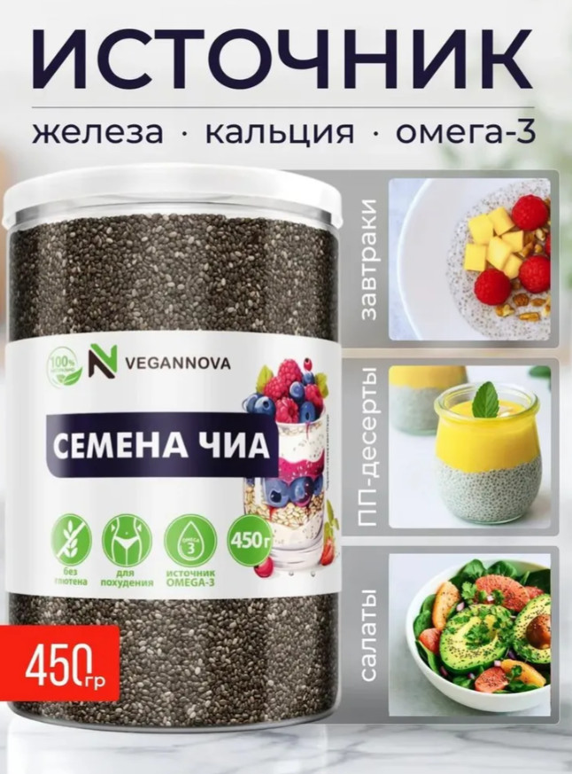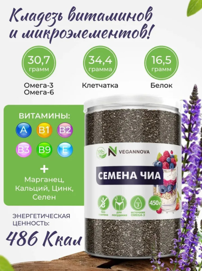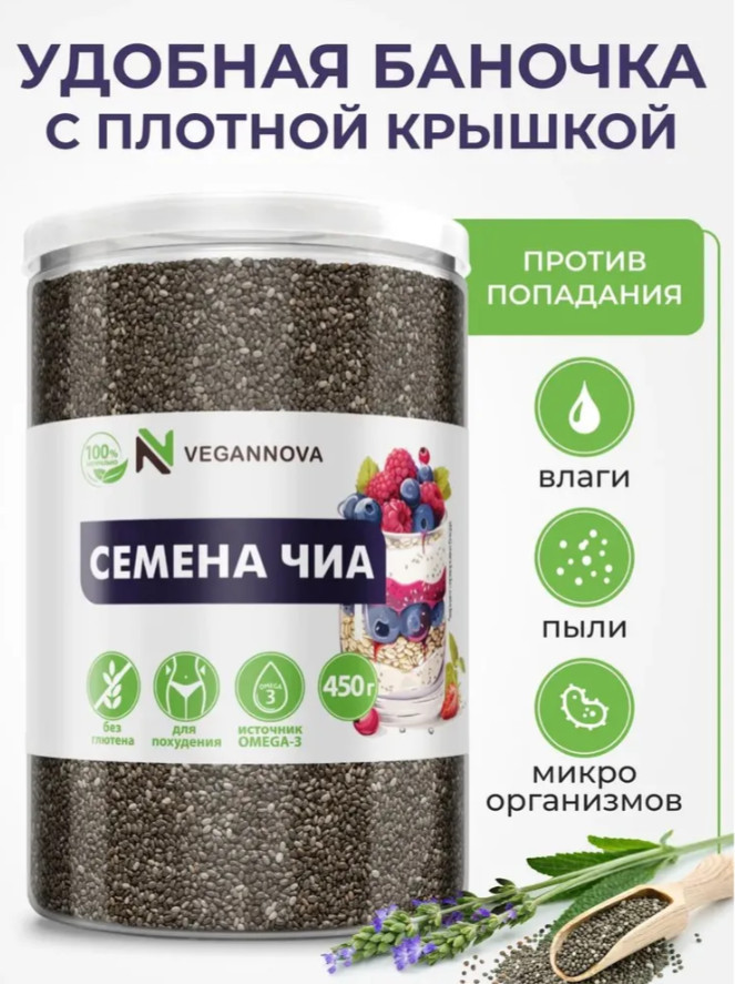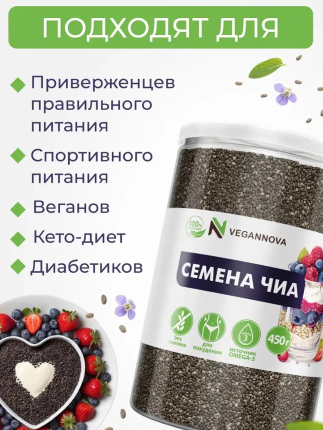 | Vegannova Натуральные семена чиа для похудения+60 (бонусов)