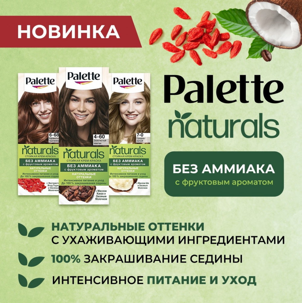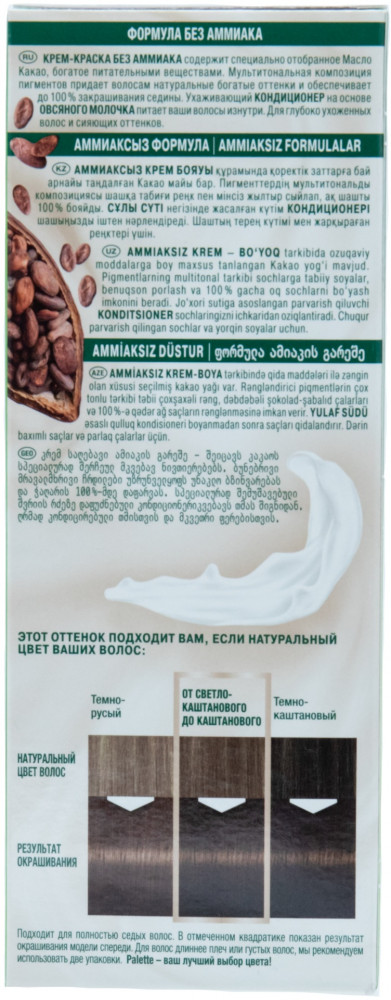 Откройте для себя стойкую крем-краску Палетт Naturia без аммиака! Окрашивающий крем без аммиака содержит специально подобранное масло Ши, богатое питательными веществами. Мультитональные окрашивающие пигменты позволяют получить естественный многогранный цвет, сияющие русые оттенки и до 100% закрашивания седины. Ухаживающий кондиционер с овсяным молочком питает волосы изнутри. Для ухоженных волос и естественных живых оттенков!