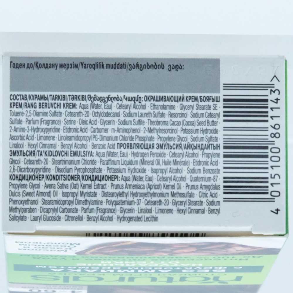 Окрашивающий крем: Aqua (Water, Eau), Cetearyl Alcohol, Ethanolamine, Glyceryl Stearate SE, Ceteareth-20, Octyldodecanol, Sodium Laureth Sulfate, Sodium Cetearyl Sulfate, Parfum (Fragrance), Serine, Oleic Acid, Silica, Glycerin, Butyrospermum Parkii (Shea) Butter, Toluene-2,5-Diamine Sulfate, Sodium Sulfite, Etidronic Acid, Carbomer, Resorcinol, Potassium Hydroxide, Ascorbic Acid, Limonene, Propylene Glycol, Sodium Sulfate, Linalool, Hexyl Cinnamal, m-Aminophenol, Benzyl Alcohol, Benzoic Acid, 2-Amino-4-Hydroxyethylaminoanisole Sulfate, 2-Methylresorcinol, 4-Chlororesorcinol, 4-Amino-m-Cresol.