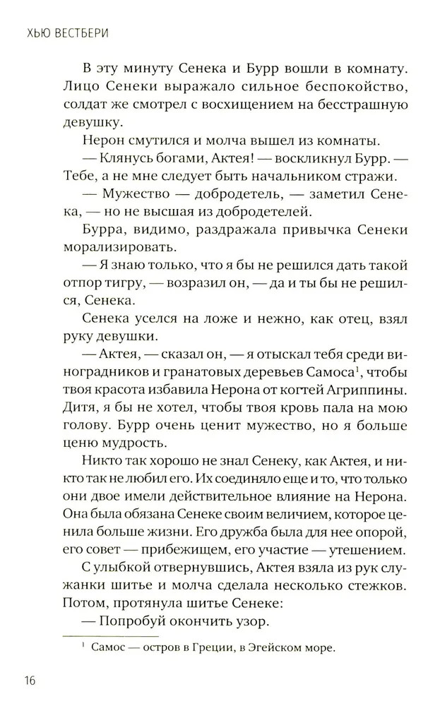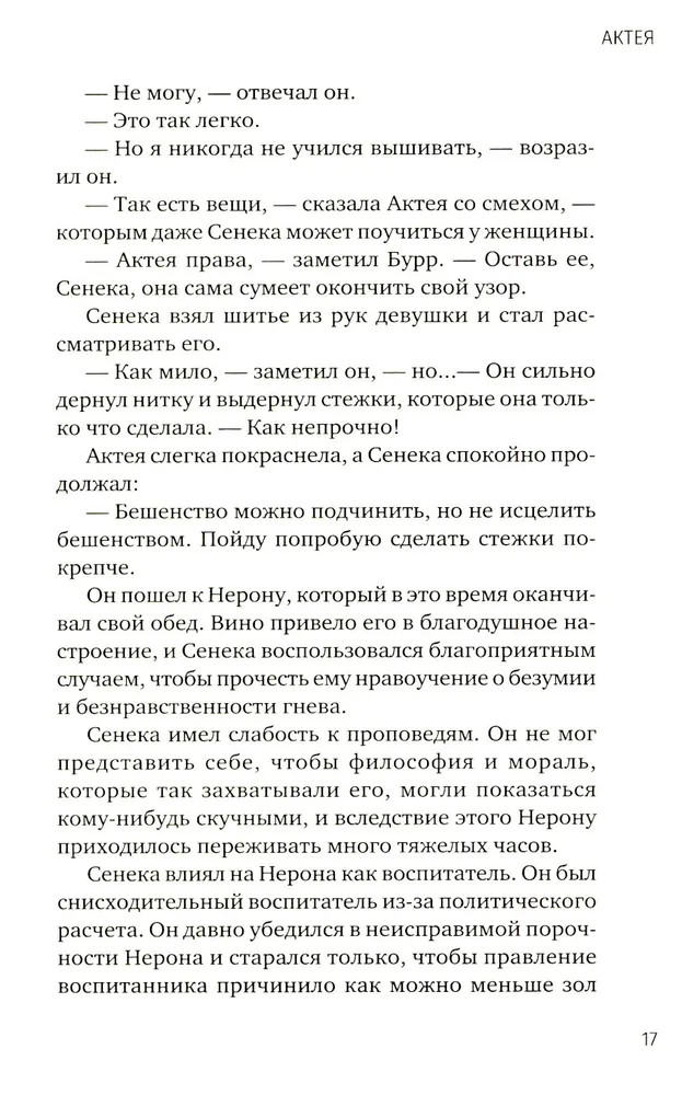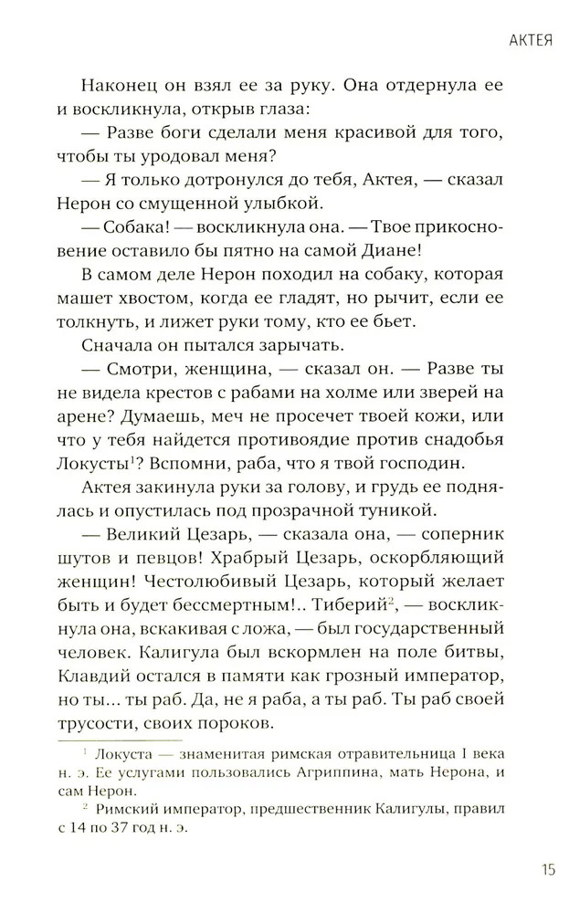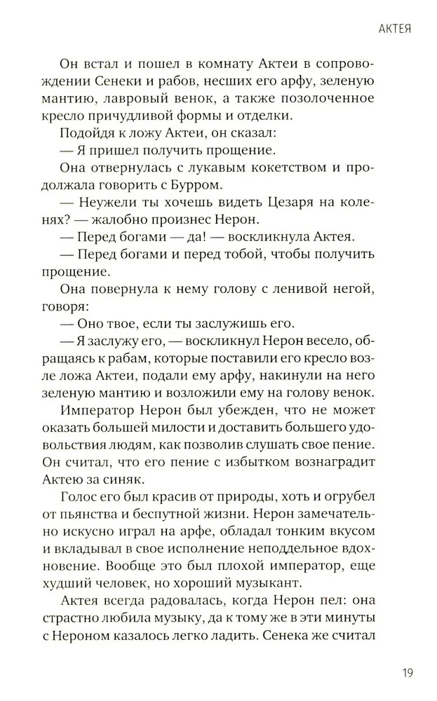 💳 Оплатить за товар можно при получении 🇰🇿 Есть бесплатная доставка по Казахстану от 1 дня 🎁 Копите бонусы с каждой покупки Серия: Одна история любви Актея — прекрасная гречанка с острова Самос — каждый день укрощает свирепого тигра. Этот тигр — молодой римский император Нерон. Мудрый наставник Нерона, философ Сенека, нарочно познакомил Актею со своим учеником, чтобы она смягчала свирепый нрав Нерона ради блага римского государства и народа. Однако Актея искренне любит Нерона. Его счастье для нее важнее, чем абстрактное государственное благо. Актея даже готова пожертвовать собственным счастьем, поэтому уступает Нерона расчетливой патрицианке Поппее. Если он увлекся Поппеей, так тому и быть. Но, кажется, для Нерона, для государства и даже для Поппеи было бы лучше, если бы Актея проявила эгоизм и никому не отдавала власть над тигром. |