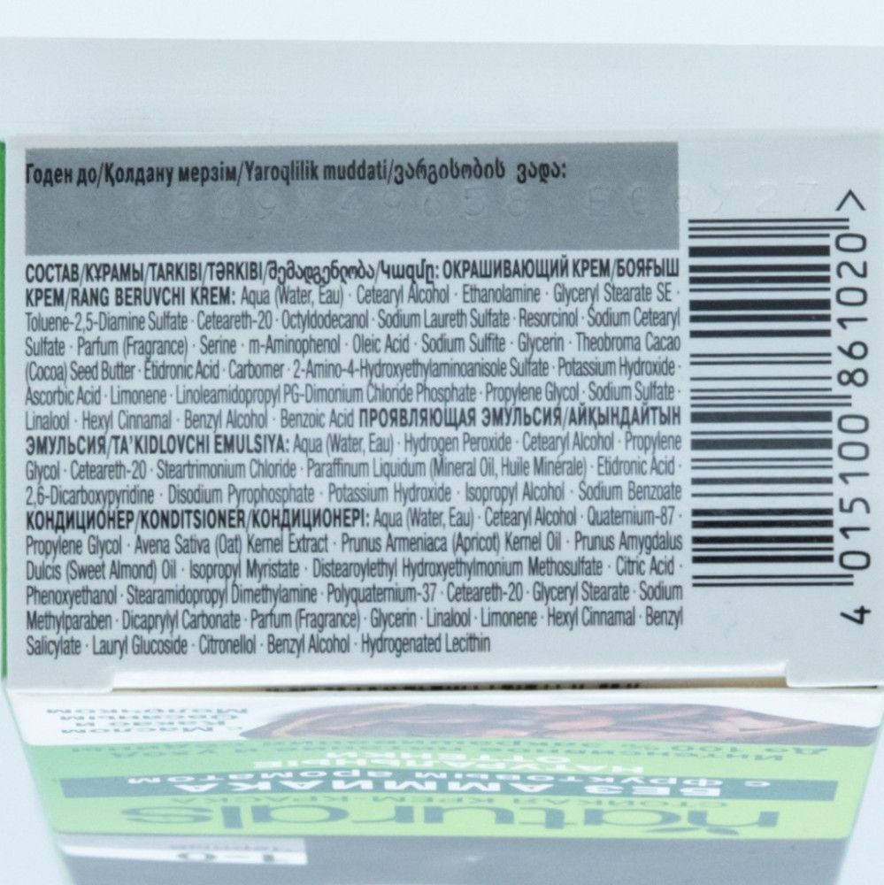 Окрашивающий крем: Aqua (Water, Eau), Cetearyl Alcohol, Ethanolamine, Glyceryl Stearate SE, Ceteareth-20, Octyldodecanol, Sodium Laureth Sulfate, Sodium Cetearyl Sulfate, Parfum (Fragrance), Serine, Oleic Acid, Silica, Glycerin, Butyrospermum Parkii (Shea) Butter, Toluene-2,5-Diamine Sulfate, Sodium Sulfite, Etidronic Acid, Carbomer, Resorcinol, Potassium Hydroxide, Ascorbic Acid, Limonene, Propylene Glycol, Sodium Sulfate, Linalool, Hexyl Cinnamal, m-Aminophenol, Benzyl Alcohol, Benzoic Acid, 2-Amino-4-Hydroxyethylaminoanisole Sulfate, 2-Methylresorcinol, 4-Chlororesorcinol, 4-Amino-m-Cresol.