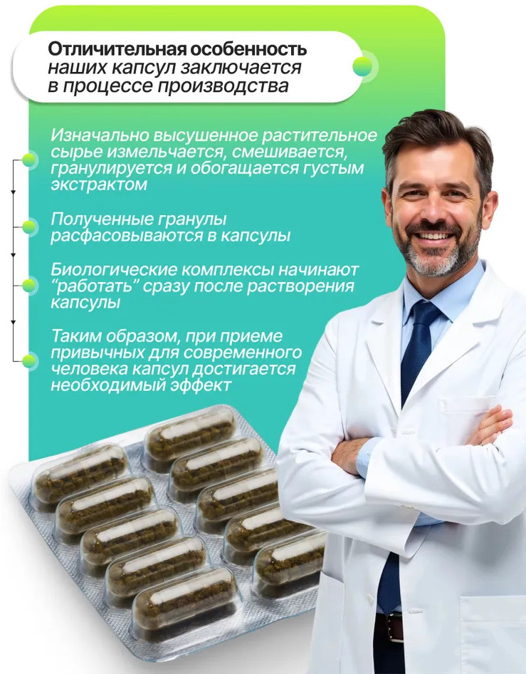 🕒 Способ применения: взрослым: по 1 капсуле 1–2 раза в день во время еды. Курс — 1 месяц. При необходимости курс повторяют.