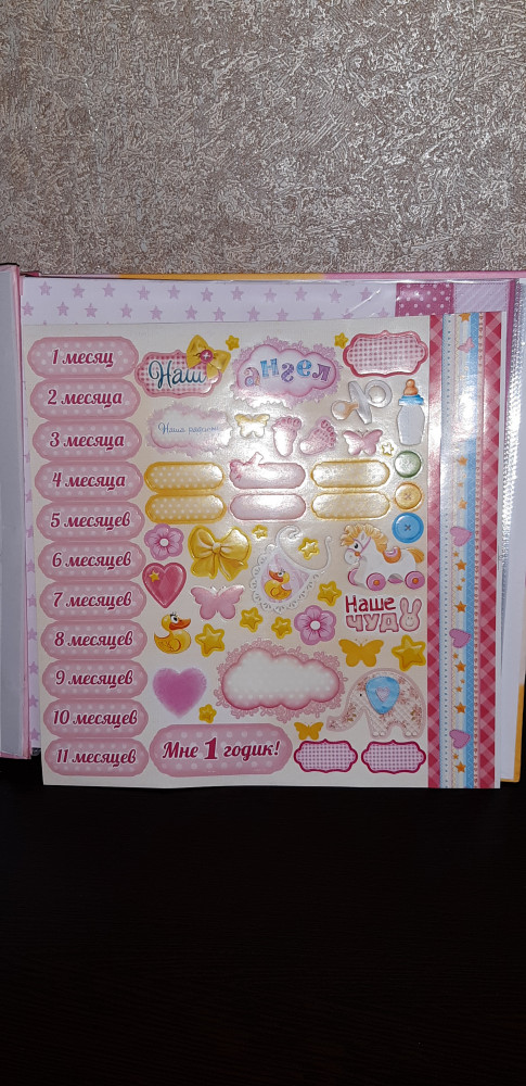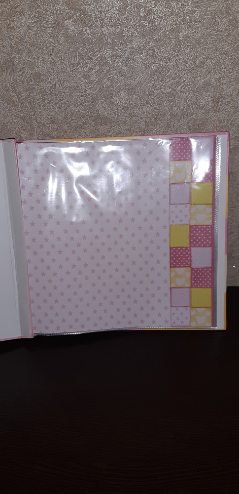 Фотоальбом красивый. Обратите внимание на размер. Больше чем А4 размер. У старших детей формат был меньше и для хранения этот формат не удобен для нас оказался. Внутри файлы с цветной вставкой. Цветная вставка только с лицевой стороны. С обратной стороны просто белый лист и нужно будет что-нибудь придумывать, оформляя эту сторону. Стоимость сейчас подешевела. Подарочная упаковка из очень тонкого картона.