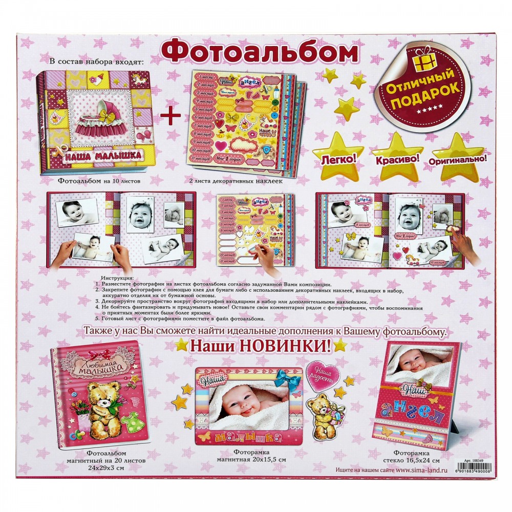 Фотоальбом в подарочной упаковке «Наша малышка» 10 листов + наклейкиВ данный момент этот товар отсутствует в продаже. Возможно, у нас найдется аналогичный или похожий товар здесь. Фотоальбом в подарочной упаковке «Наша малышка» 10 листов + наклейки - самый лучший подарок на рождение ребенка, а также сувенир на память, так как предназначен для хранения самого дорогого — фотографий Вашего малыша! Фотоальбом не простой, к нему прилагается набор ярких наклеек для оформления фотографий с забавными картинками и надписями. |