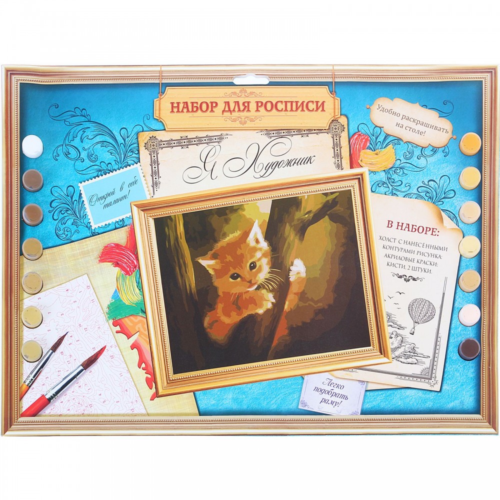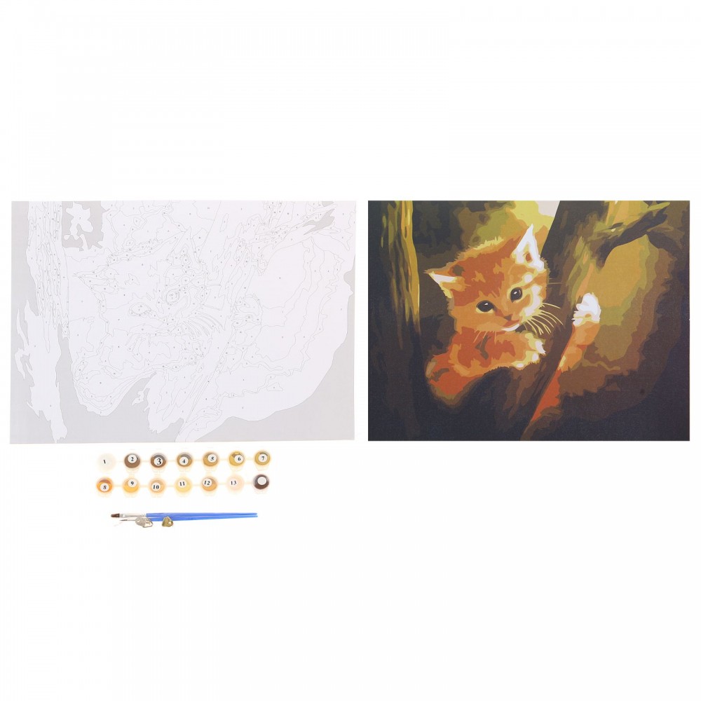 Роспись по холсту "Котёнок" по номерам с красками (без рамы), 14 шт. по 3 мл + кисти понравится и детям, и взрослым.