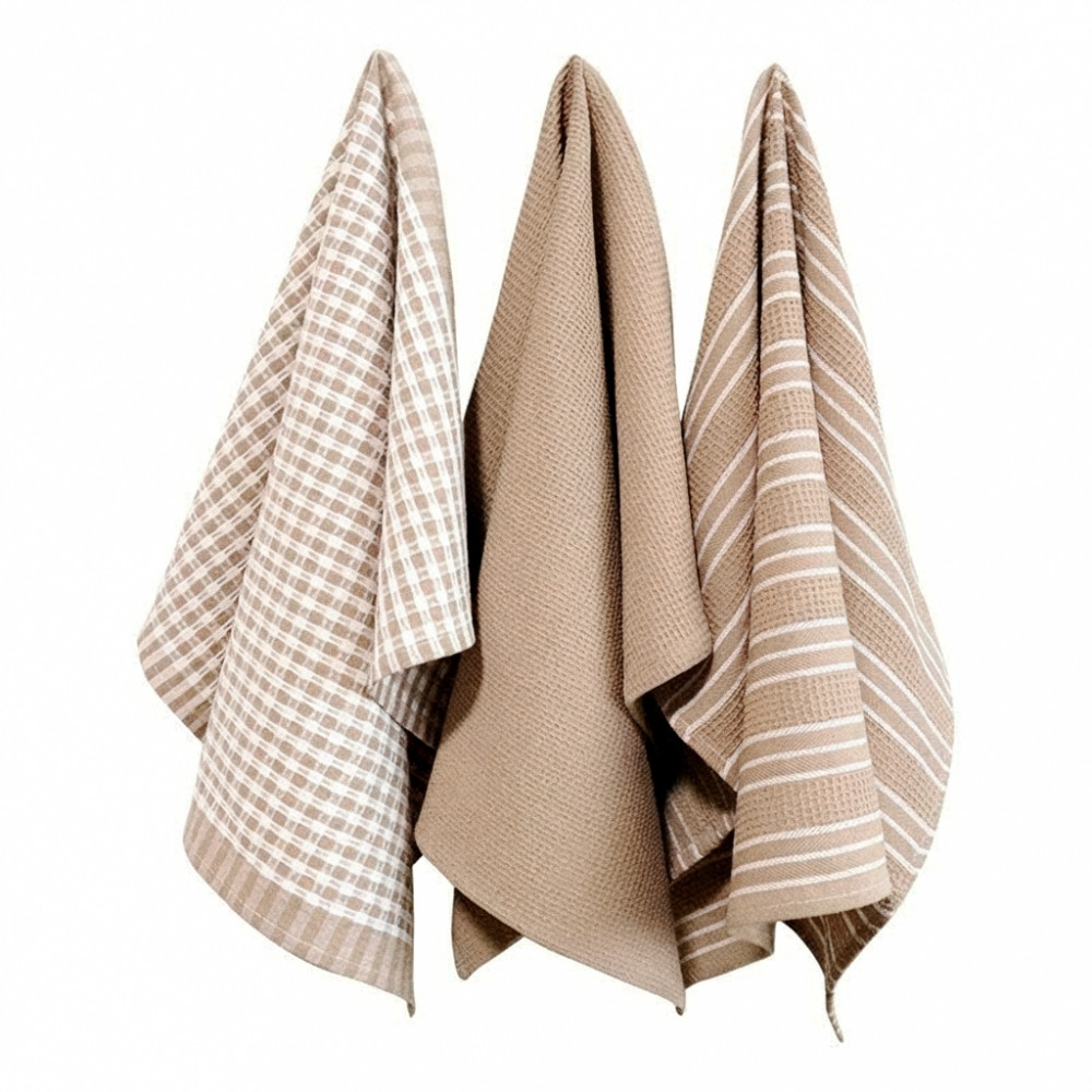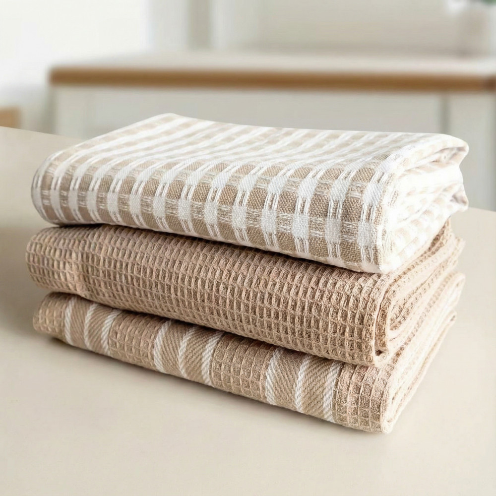 Набор кухонных полотенец Monochrome homeware — это стильное и практичное решение для вашей кухни, которое сочетает в себе высокое качество и современный дизайн. Набор из 3 кухонных полотенец выполнен из 100% хлопка. Кухонный мягкий текстиль выполнен в сочетании белого, бежевого цветов. Такой набор для кухни преобразит интерьер кухни или столовой зоны. Эффектный и всегда актуальный дизайн нежных оригинальных полотенец может легко комбинироваться с декоративными аксессуарами и домашними принадлежностями в разных интерьерных направлениях дома, квартиры или дачи.