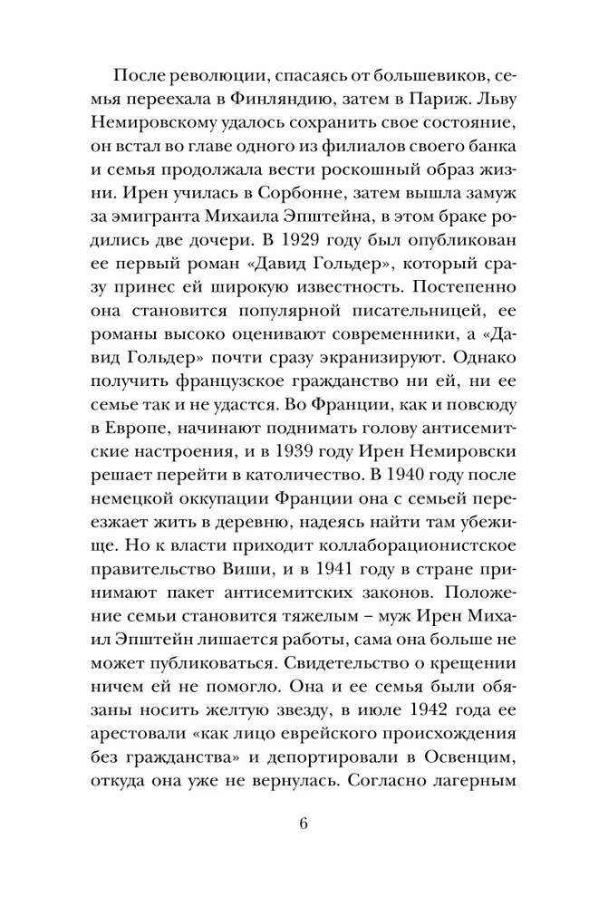 | Ирен Немировски родилась в Киеве в 1903 году и вместе с семьей эмигрировала во Францию, когда ей было 15 лет. Литературный успех пришел к Ирен в конце 20-х годов. Спасаясь от немецкого нашествия, она бежала из Парижа и поселилась в глухой деревушке, там была арестована и погибла в Освенциме в 1942. |