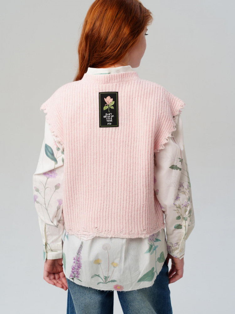 Розовый вязаный жилет для девочки подростка от PlayToday — модная и необычная вещь, которая добавит яркий акцент в гардероб. Выполнен из мягкой смесовой пряжи с добавлением шерсти, поэтому жилет хорошо держит форму, приятен к телу и сохраняет тепло. Декорирован оригинальным принтом, что придает модели актуальный стиль street fashion. На спинке — дизайнерская нашивка с цветочным мотивом.