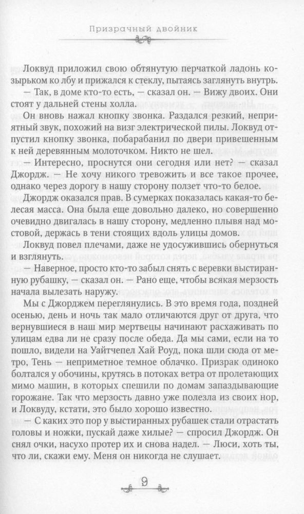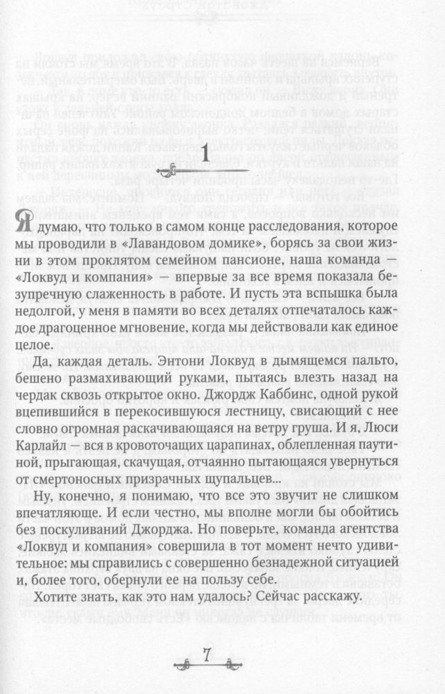 Призрачный двойникВ данный момент этот товар отсутствует в продаже. Возможно, у нас найдется аналогичный или похожий товар здесь. Меня зовут Люси Карлайл и я работаю в агентстве «Локвуд и компания». Нас всего трое: я, Энтони (он же Локвуд) и Джордж. Мы занимаемся тем, что ловим призраков и спасаем от них Лондон. |