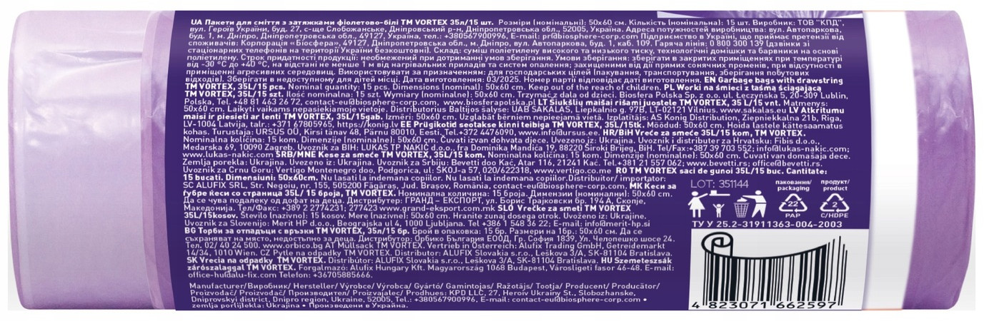 💳 Оплатить за товар можно при получении 🇰🇿 Есть бесплатная доставка по Казахстану от 1 дня 🎁 Копите бонусы с каждой покупки Мусорные мешки Vortex 35L — идеальное решение для повседневного использования дома, на кухне, в ванной или офисе. Застежка на шнурке позволяет легко закрывать мешки и выносить мусор, а прочный материал защищает от разрывов и протечек. Эстетичное сочетание белого и фиолетового цветов придает сумкам аккуратный вид и делает их подходящими для интерьеров, где важна не только функциональность, но и внешний вид. Изготовлено из полиэтиленовой пленки высокой плотности (HDPE) — прочное и устойчивое к разрывам. |