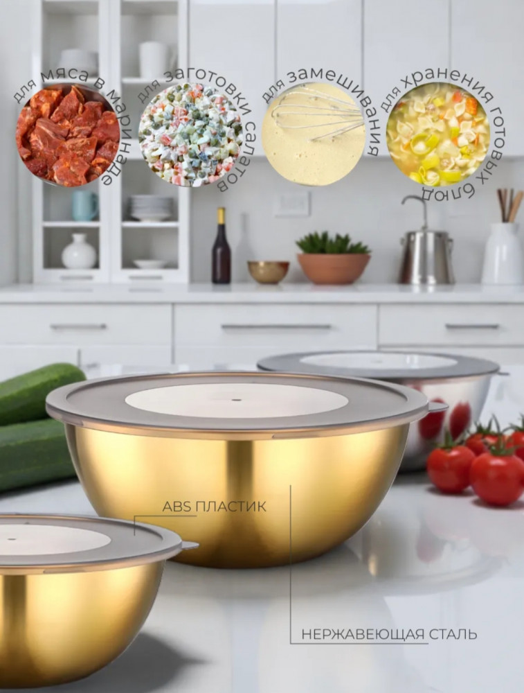 Каждая миска оснащена крышкой из прочного и экологичного материала — ABS-пластика, обеспечивающего герметичность закрытия и надежную защиту продуктов от воздействия окружающей среды. Это позволяет эффективно применять изделие для хранения любых видов пищи, будь то готовые блюда или ингредиенты для готовки. Благодаря удобному дизайну и продуманным размерам, емкости легко размещаются одна внутри другой, экономя пространство кухни.