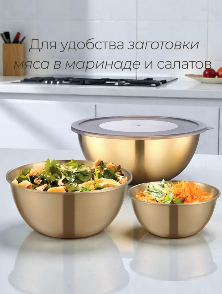 Набор мисок из нержавеющей стали с крышками станет отличным решением для тех, кто ценит комфорт и удобство использования кухонной утвари каждый день. Этот универсальный комплект идеально подойдет для дома, прекрасно впишется для дачи, а также пригодится в дорогу. Набор включает три вместительных миски разного размера, выполненных из высококачественной пищевой нержавеющей стали, благодаря чему обеспечивается долговечность изделий и простота ухода.