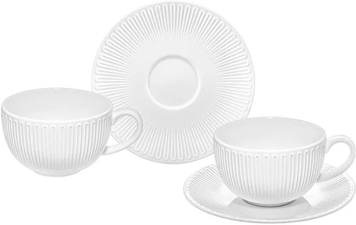 Набор 2 чайных пар Elan Gallery «Ампир Нуво» выполнен из белого фарфора и украшен лаконичным рельефом. Ритмичный, архитектурный узор продолжает эстетику, вдохновлённую стилем ампир, и переосмысляет её в новом ключе. Объём каждой чашки — 300 мл, размер — 13×10×6.5 см. Размер каждого блюдца — 16×16×2 см. Чашки с блюдцами для десерта украсят ваш стол своим эстетичным дизайном как на праздник, так и в будни. Используйте блюдце как подставку для чашки, чтобы порадовать гостей изящной сервировкой. Положите на десертную тарелку кусочек торта, домашнего пирога или пирожное. Небольшая тарелочка подойдёт не только для десерта, но и закусок: сырной нарезки, сырокопчёной колбасы или свежих овощей и зелени.