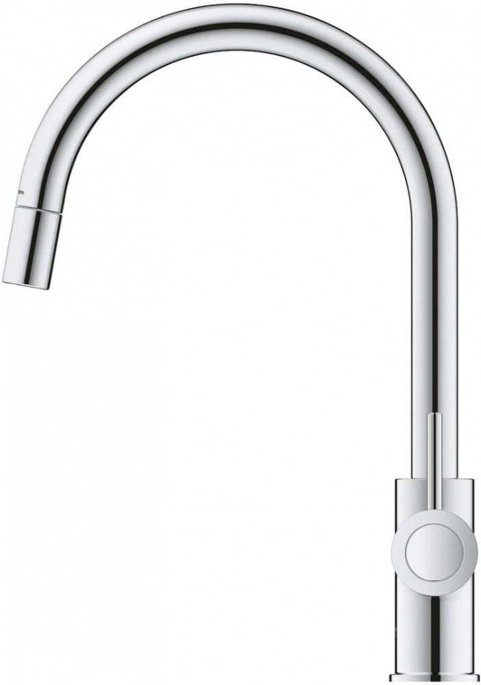 Внутри установлен керамический картридж GROHE Long-Life диаметром 28 мм, обеспечивающий плавное, точное и долговечное управление напором и температурой воды. Боковое расположение рычага удобно в повседневном использовании и не мешает работе на мойке. Высокий C-образный излив высотой 20.8 см с выносом 21.5 см подходит для мытья посуды и наполнения крупной кухонной утвари.